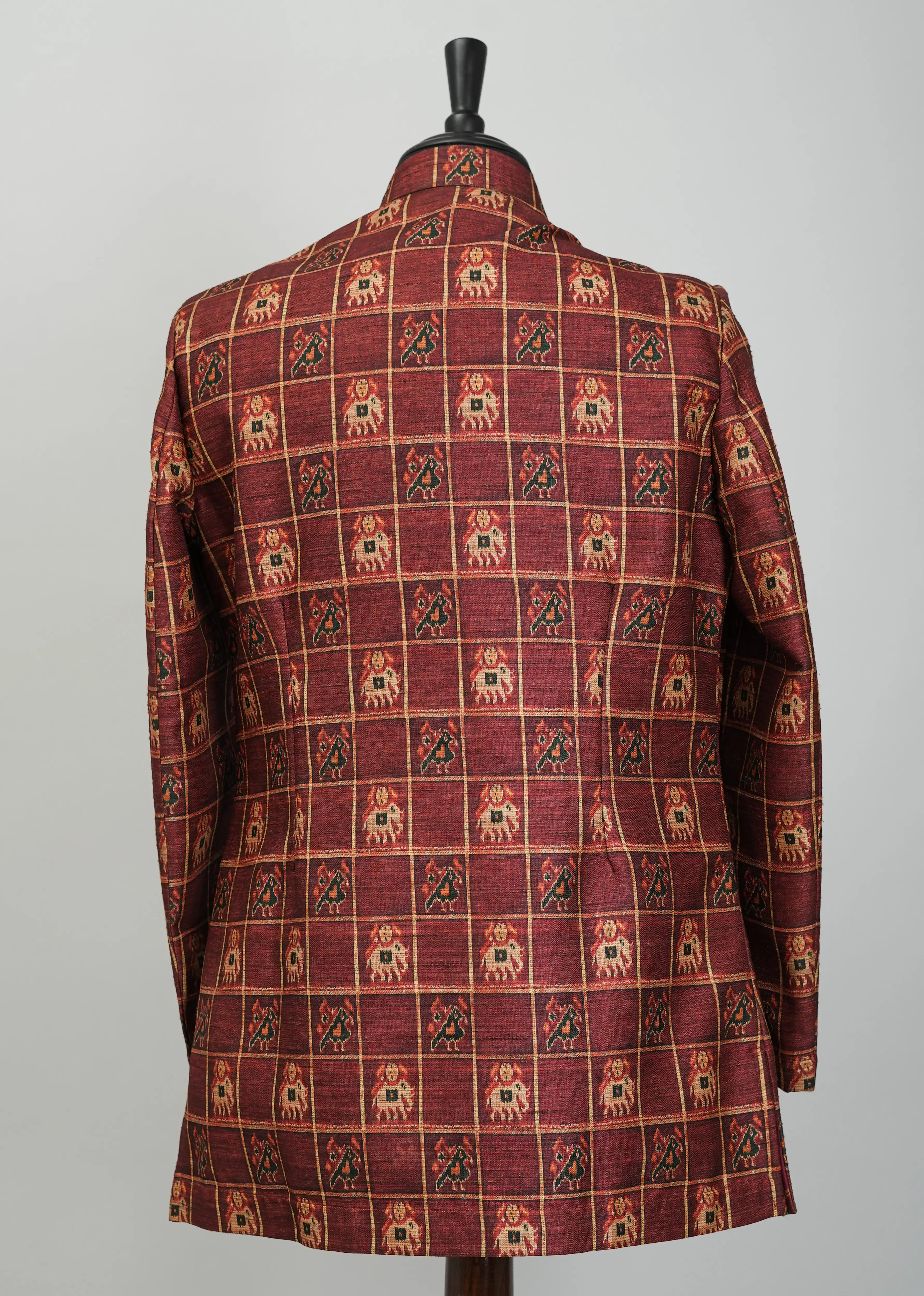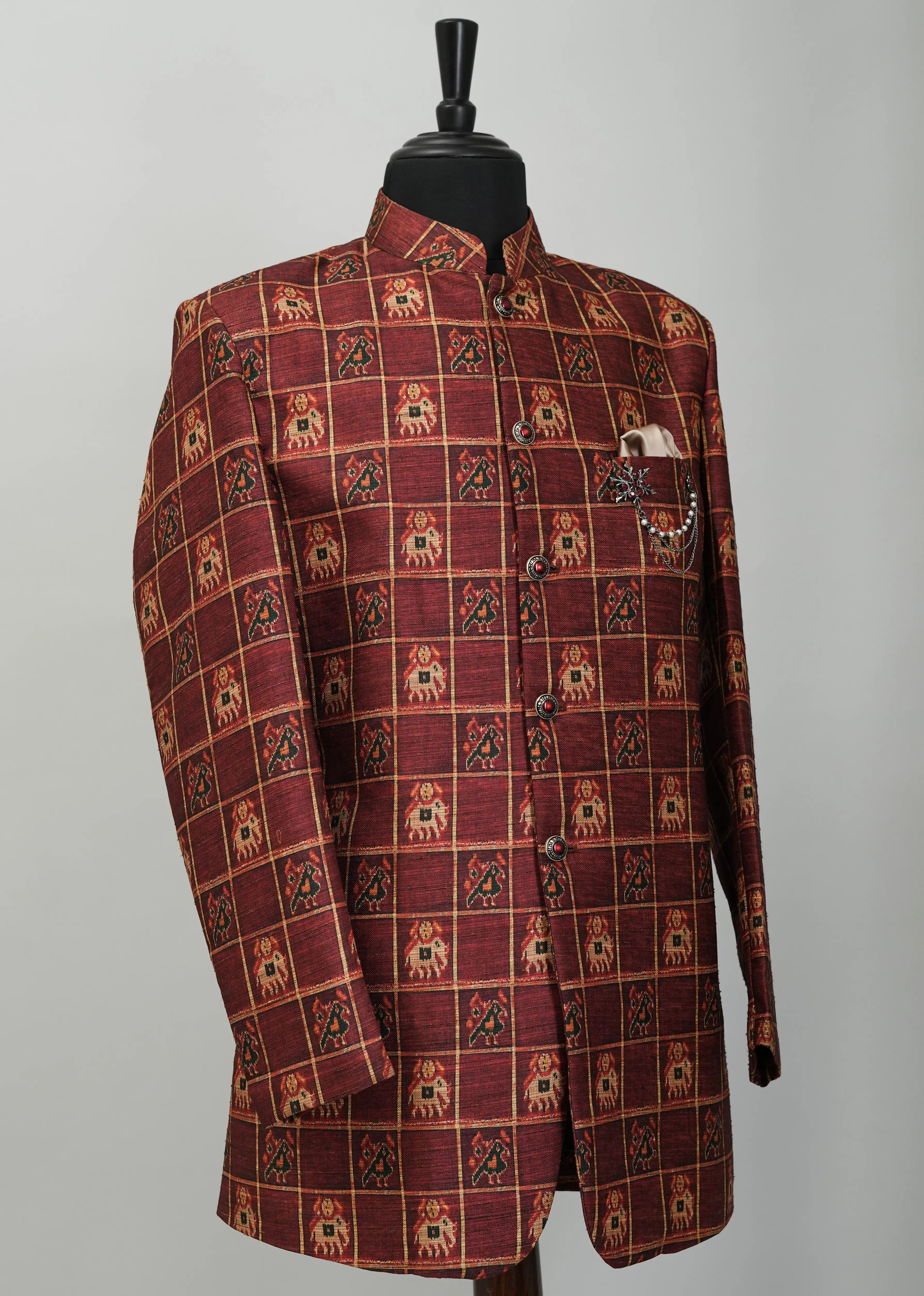 The internal composition of fully fused fabric gives this a composed look and stays in form even after long hours of wearing.(Indo, Pocket Square, Broach, Golden Pajama And Maroon.)