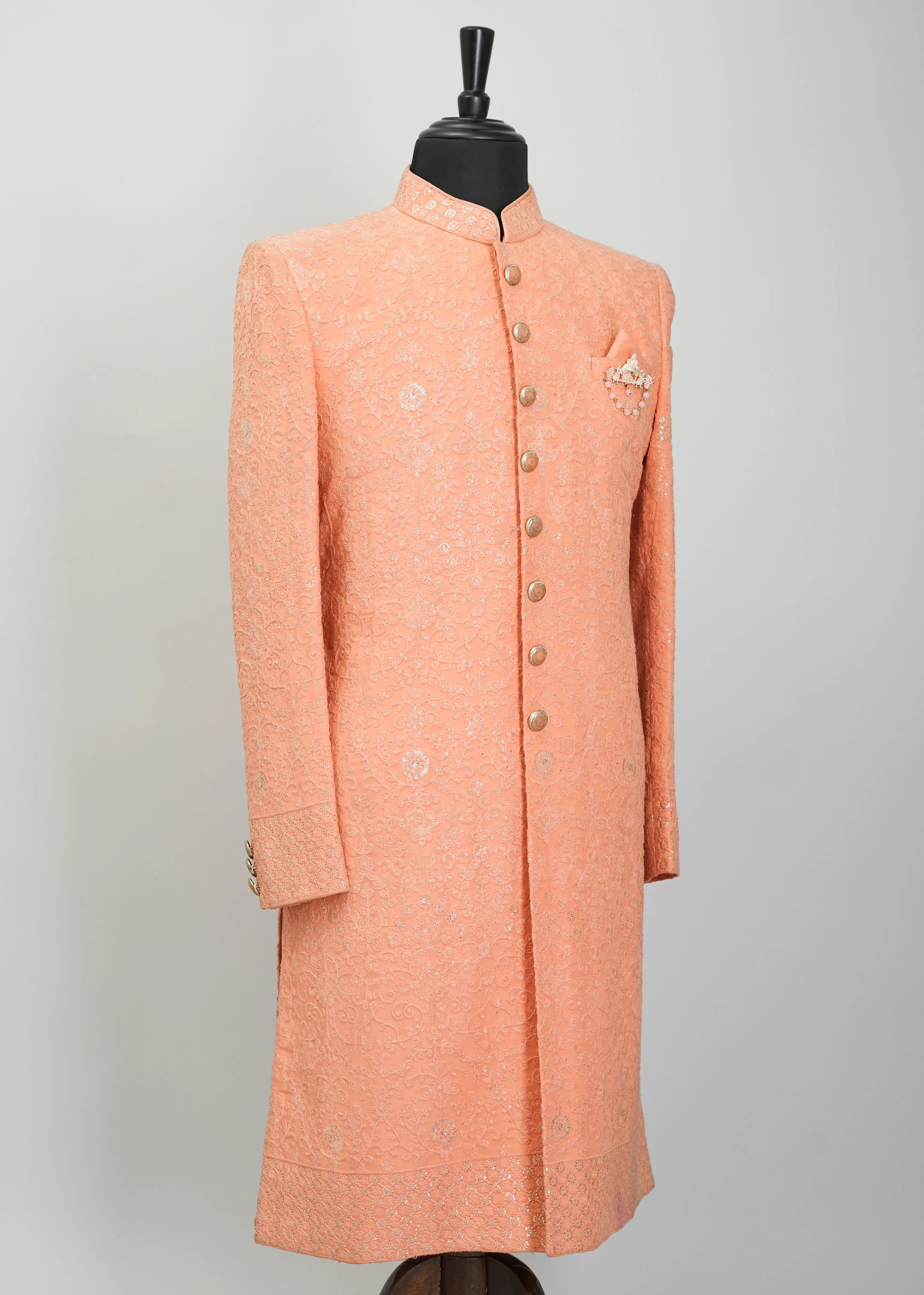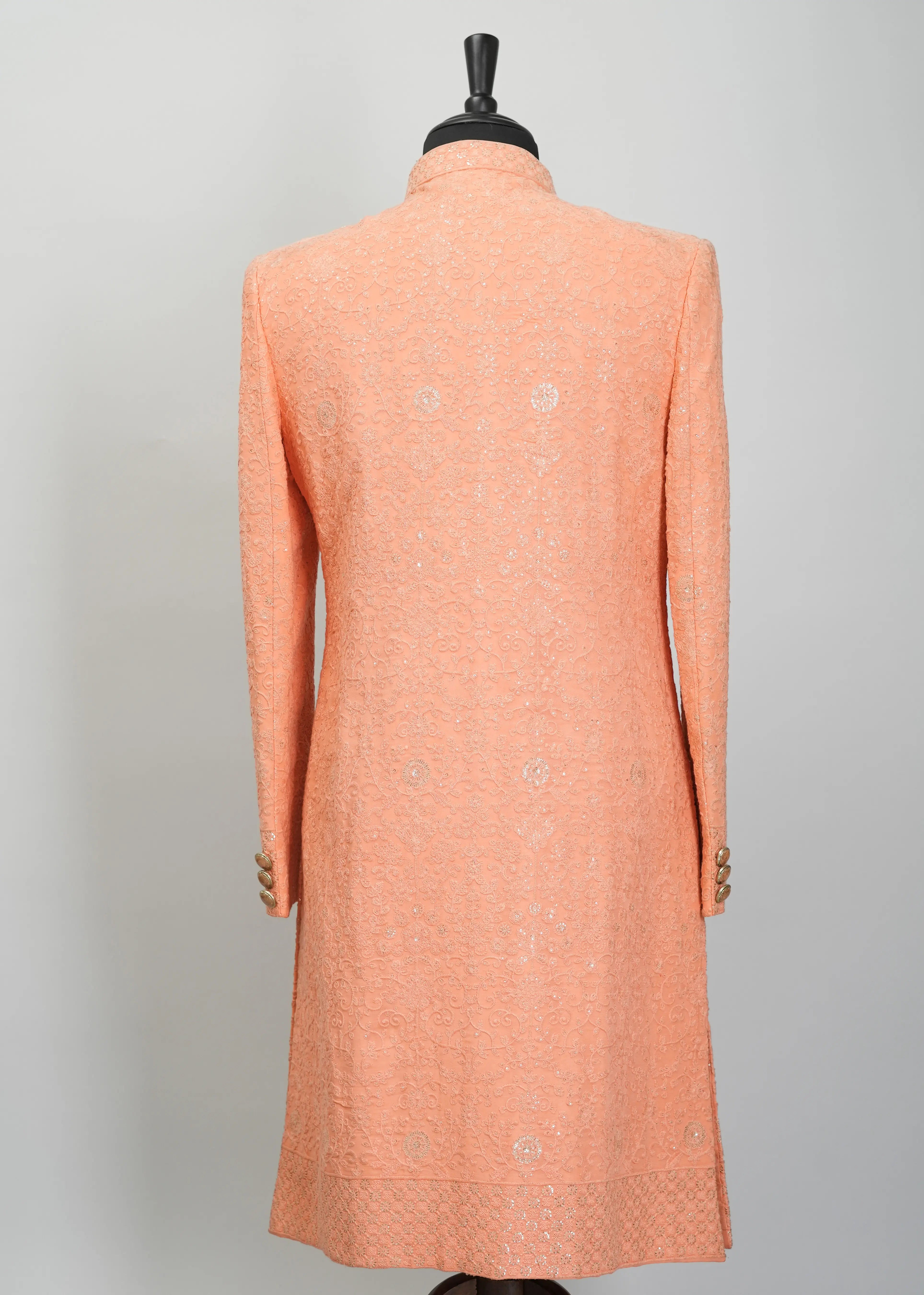 Handmade customized designer men's indowestern sherwani. Made from Silk blend fabric with satin finish that makes it comfortable eastern men's outfit to wear at wedding and other traditional occasions. Heavy thread-work accompanied by matching stone work and sequencing done through the garment.