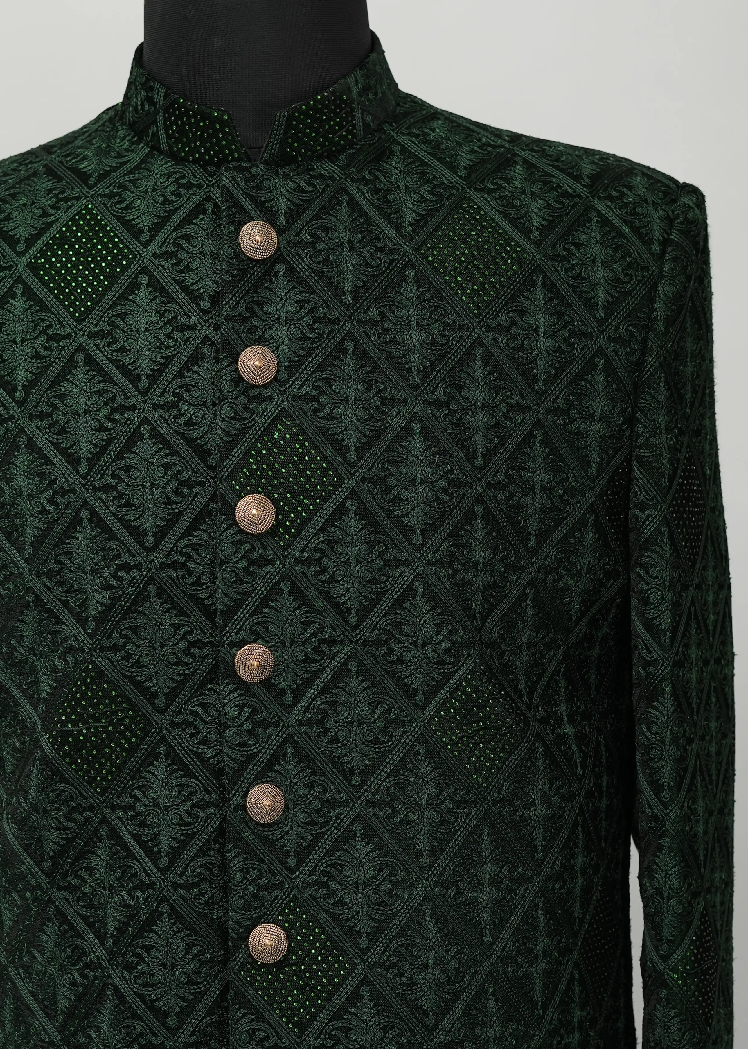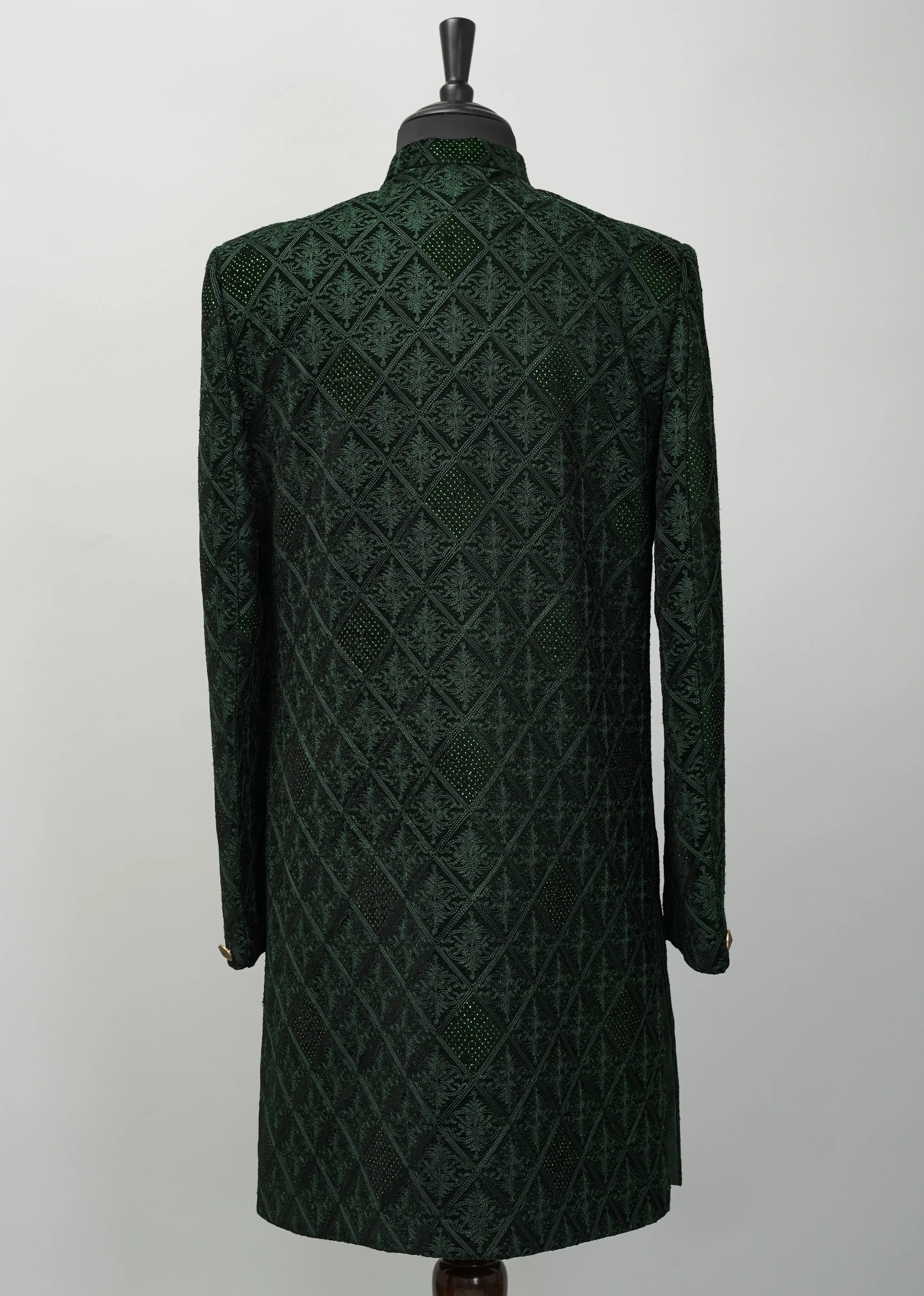 Handmade customized designer men's indowestern sherwani. Made from Silk blend fabric with satin finish that makes it comfortable eastern men's outfit to wear at wedding and other traditional occasions. Heavy thread-work accompanied by matching stone work and sequencing done through the garment.