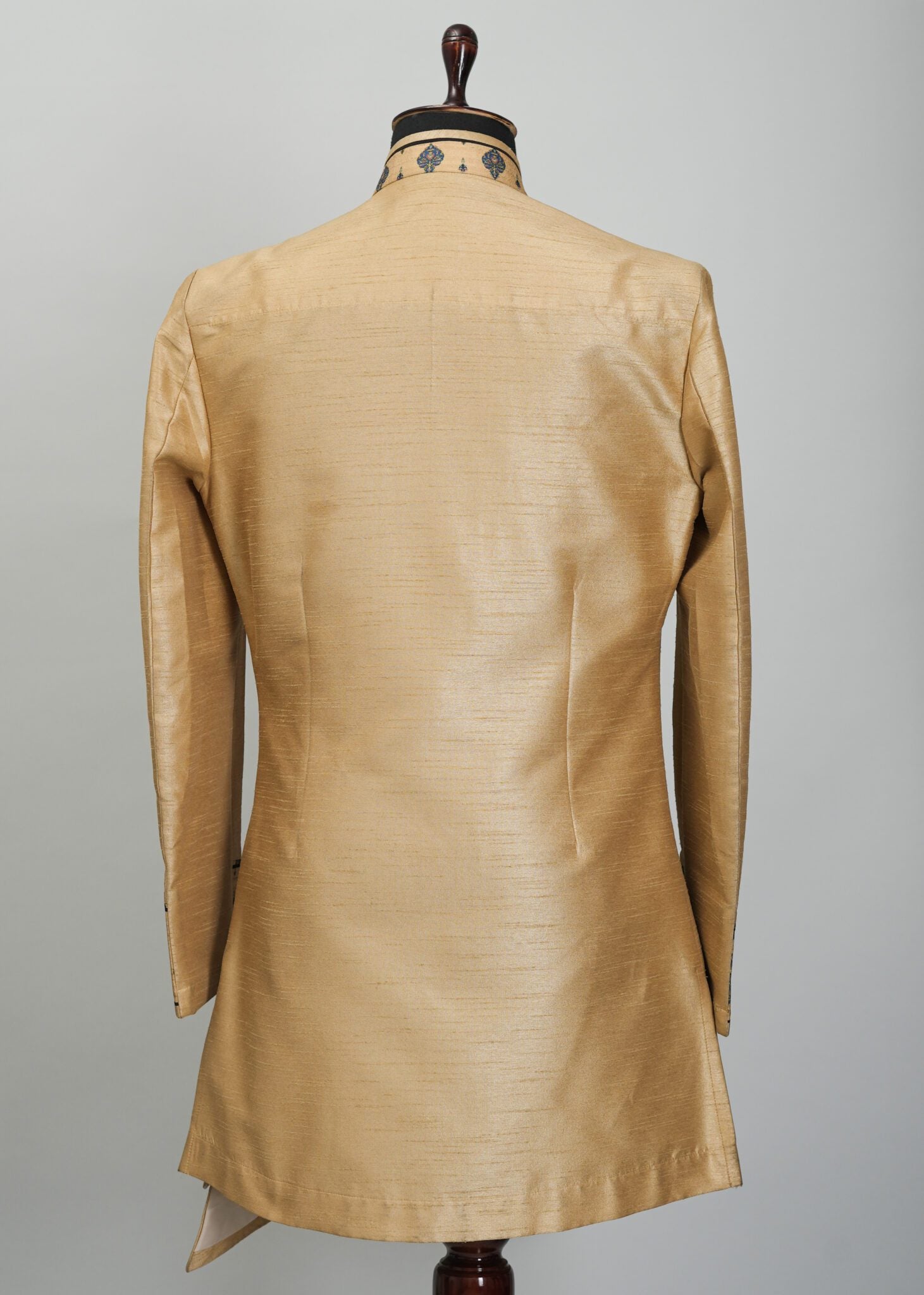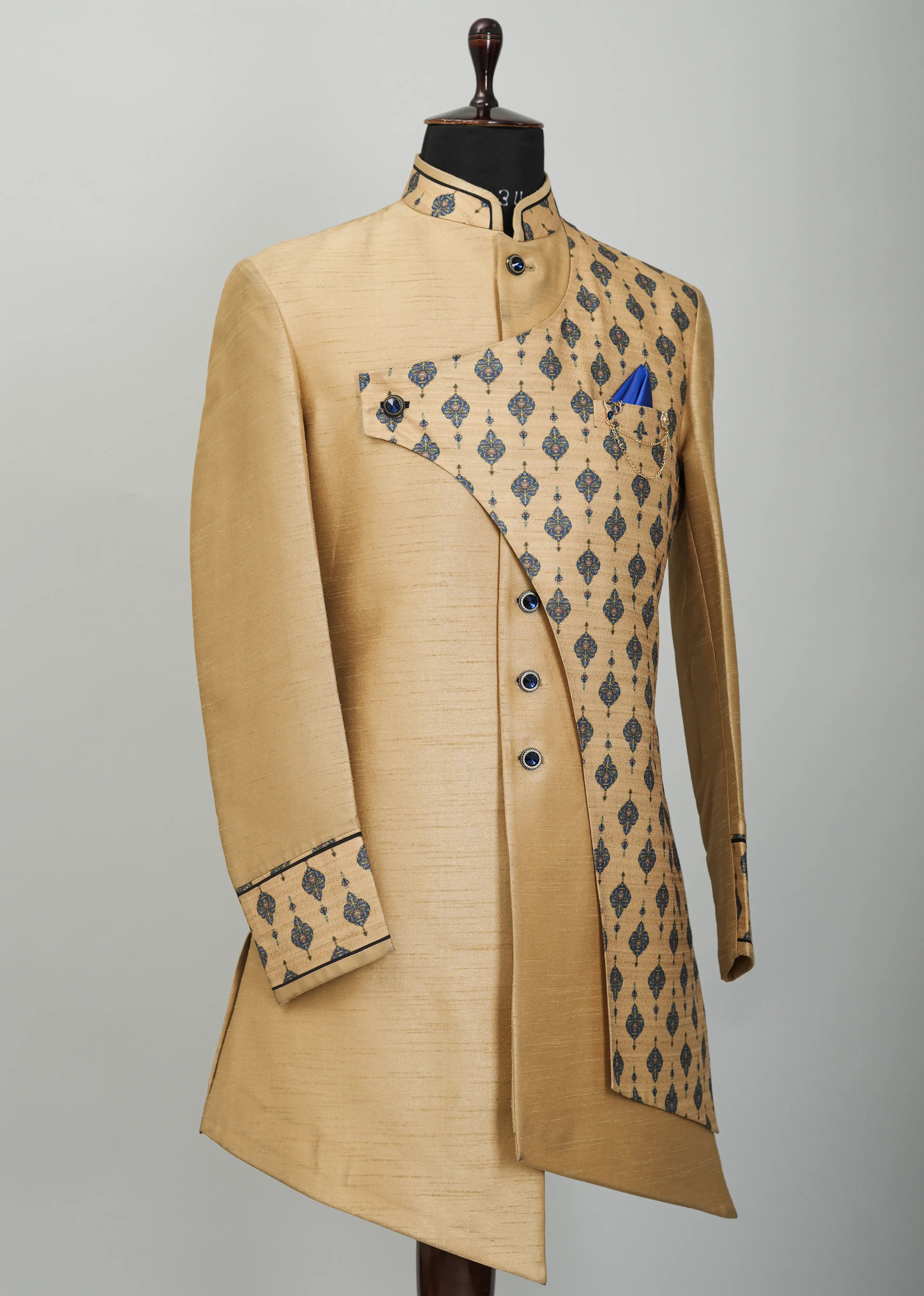 Handmade customized designer men's indowestern sherwani. Made from Silk blend fabric with satin finish that makes it comfortable eastern men's outfit to wear at wedding and other traditional occasions.