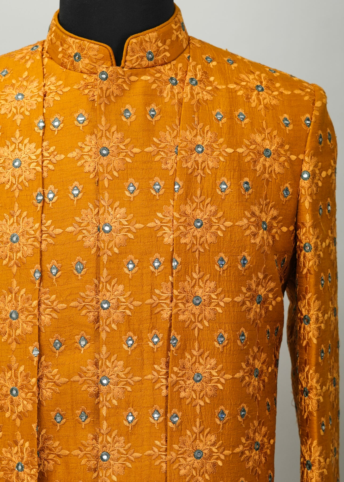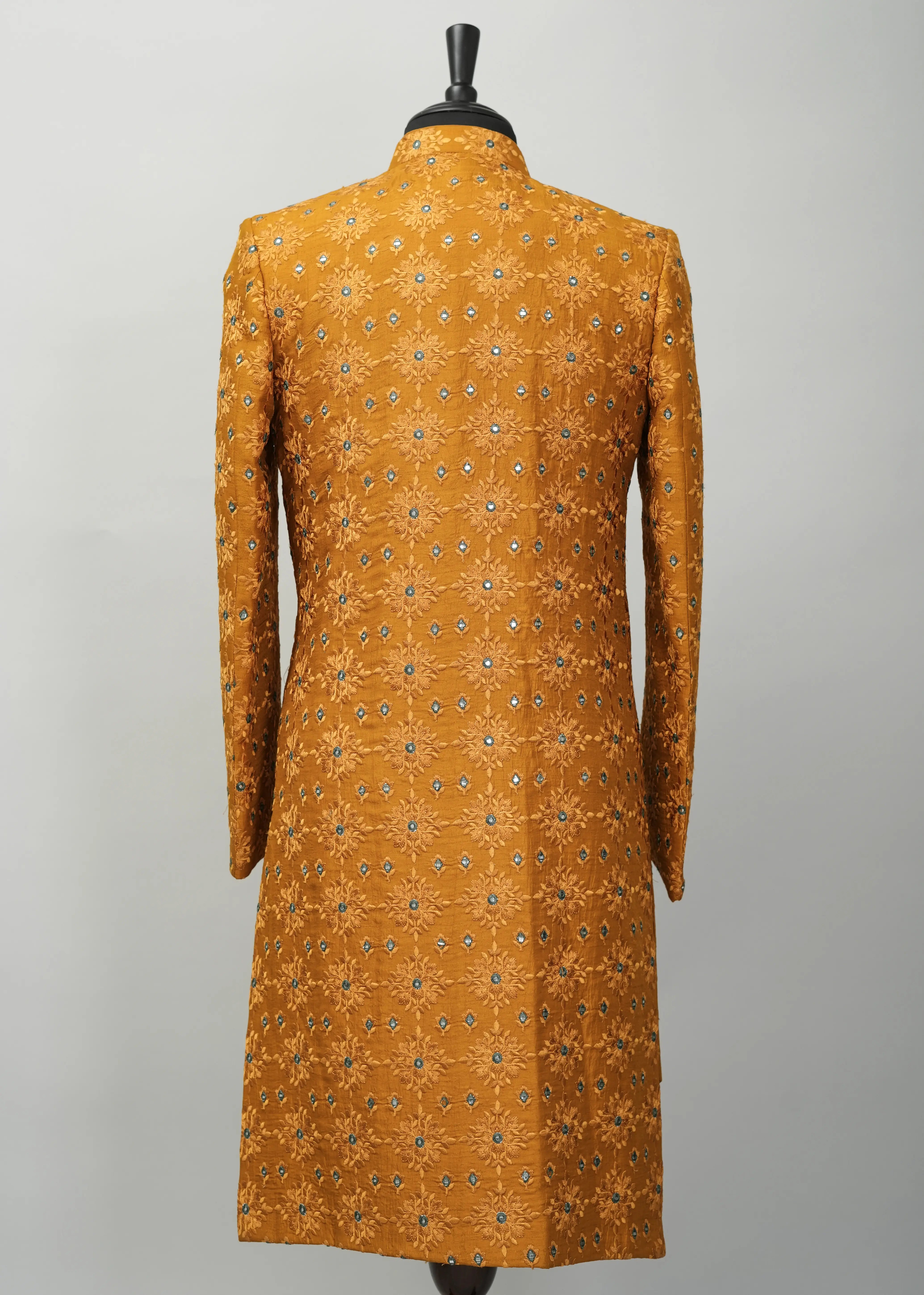 Handmade customized designer men's indowestern sherwani. Made from Silk blend fabric with satin finish that makes it comfortable eastern men's outfit to wear at wedding and other traditional occasions.Heavy thread-work accompanied by matching stone work and sequencing done through the garment.
