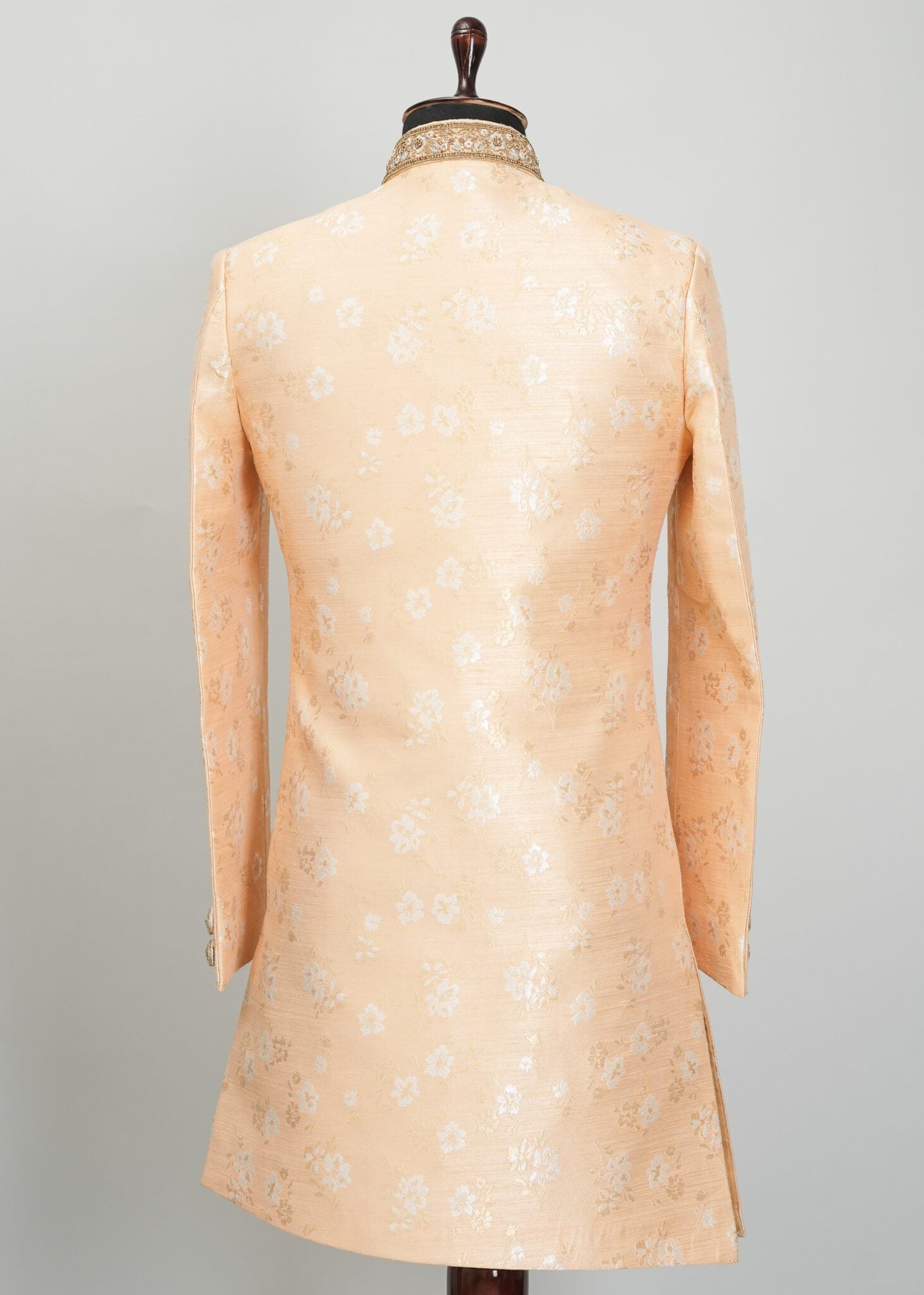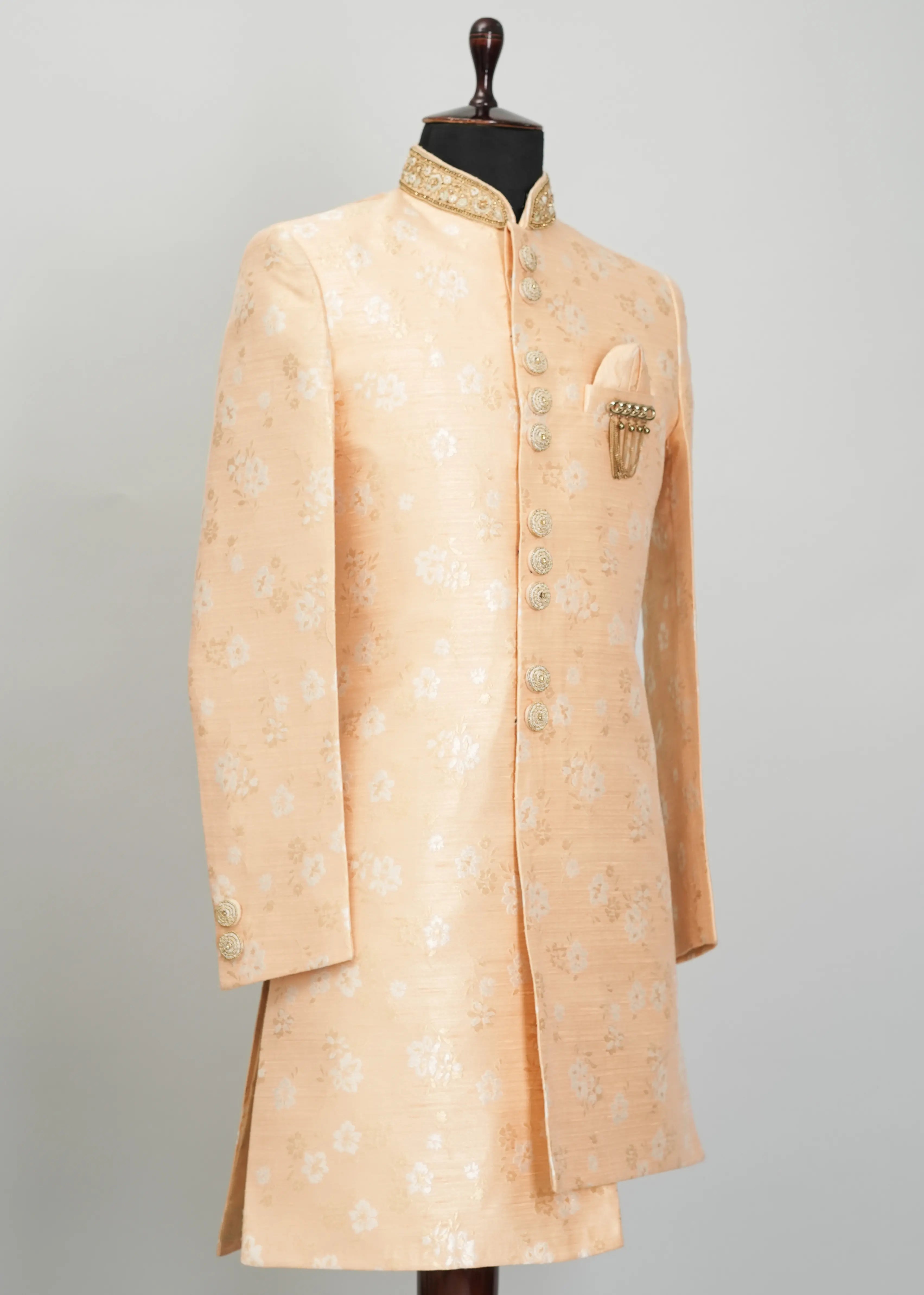 The internal composition of fully fused fabric gives this a composed look and stays in form even after long hours of wearing.(Indo, Pajama, Pocket Square, Broach And Peach Colour.)