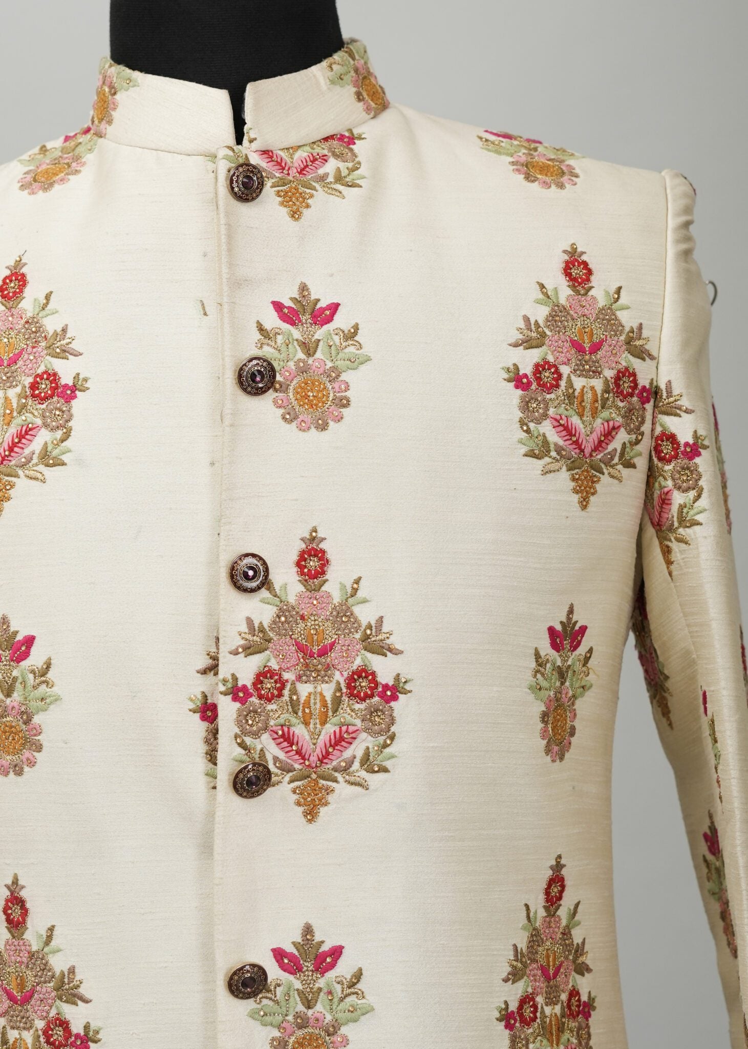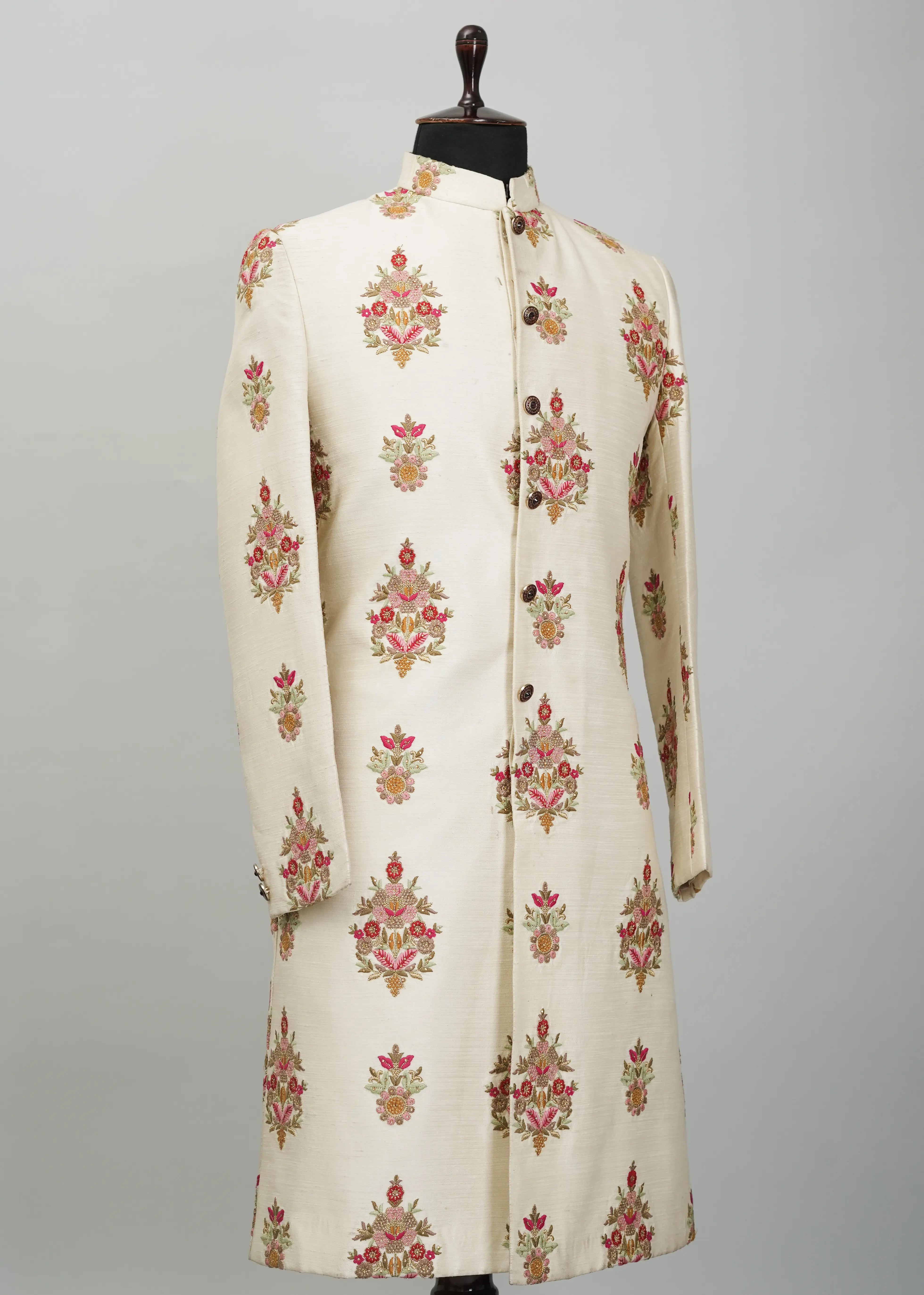 Handmade customized designer men's indowestern sherwani. Made from Silk blend fabric with satin finish that makes it comfortable eastern men's outfit to wear at wedding and other traditional occasions.Heavy thread-work accompanied by matching stone work and sequencing done through the garment.