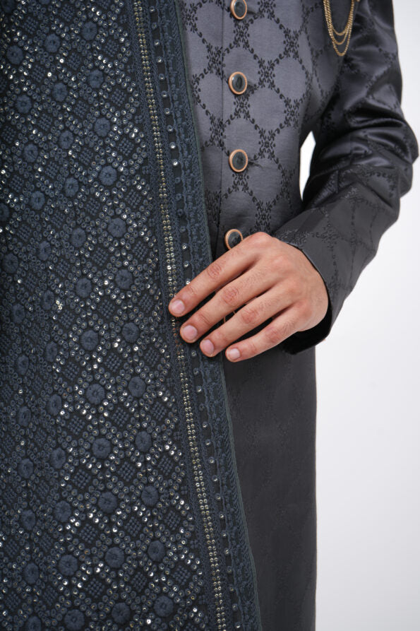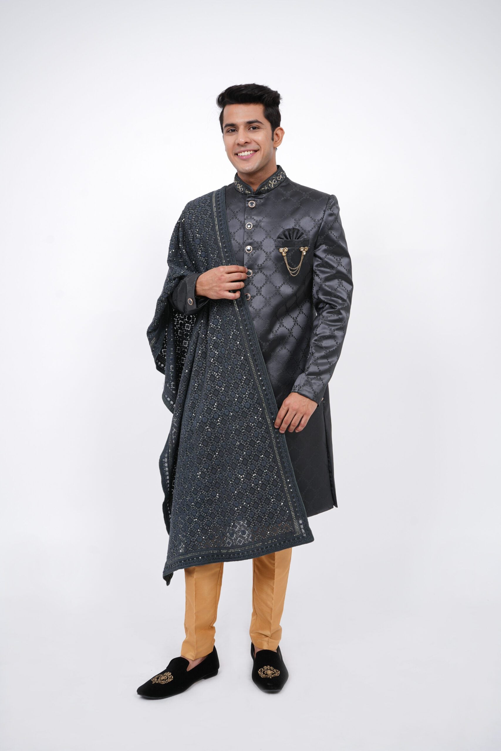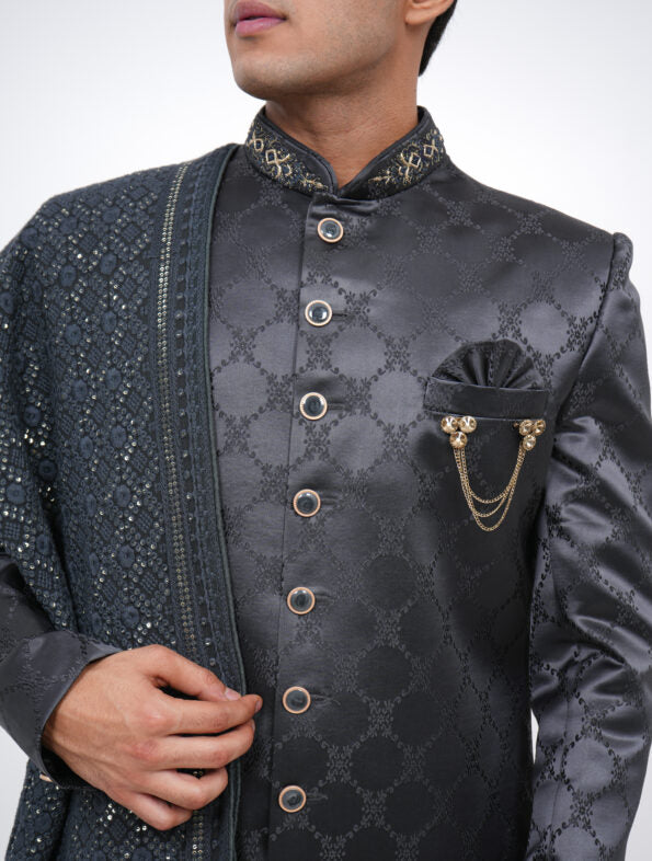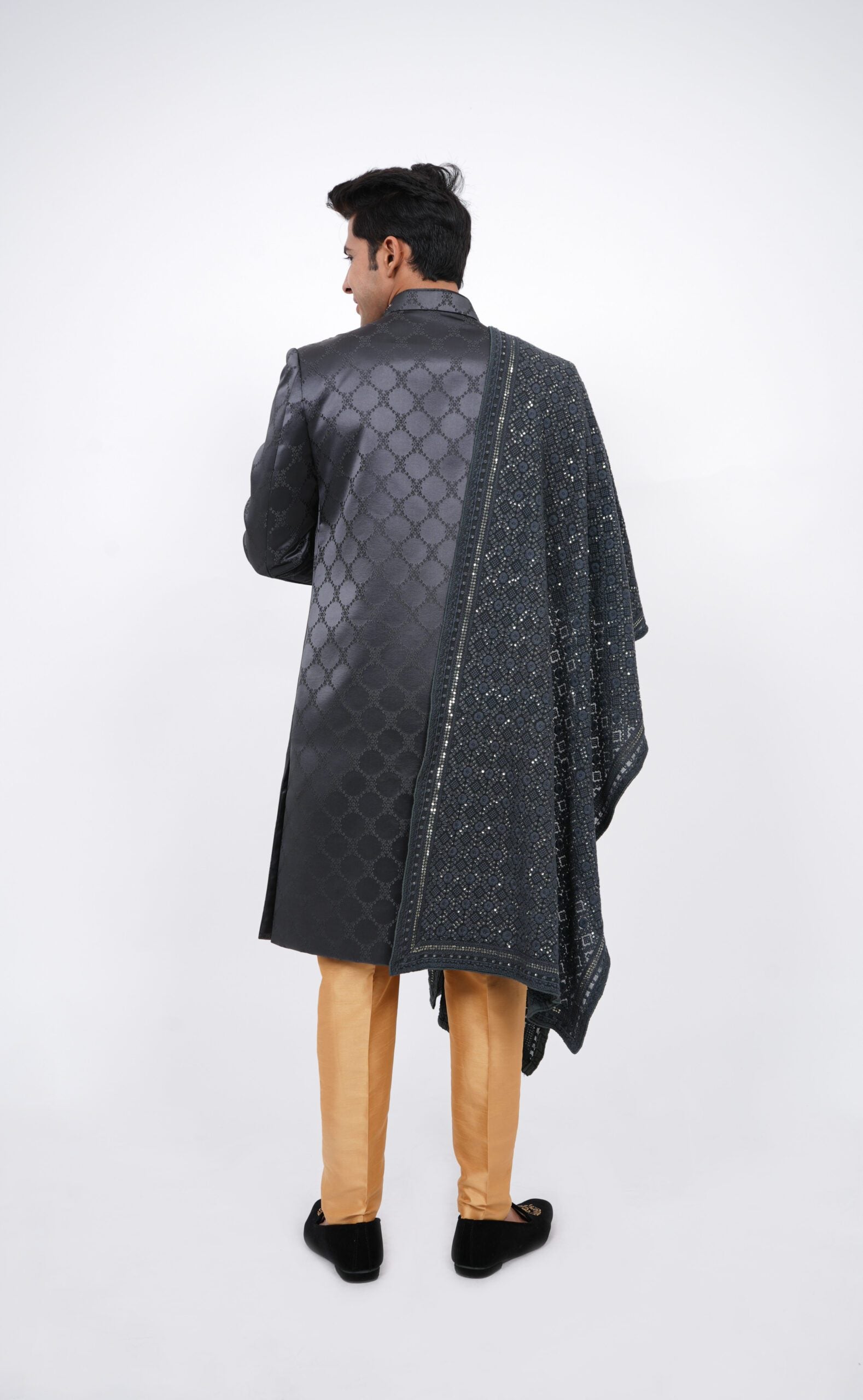 Feel luxurious in this premium black indowestern in "achkan-style" with velvet-look and contrasting motifs. The jaquard fabric helps maintain composure, while neck work makes this dress a royalty amongst all. Accompanied with black lakhnavi dupatta adorning sequence-work and paired with golden churidaar-style pajama.