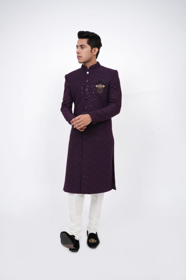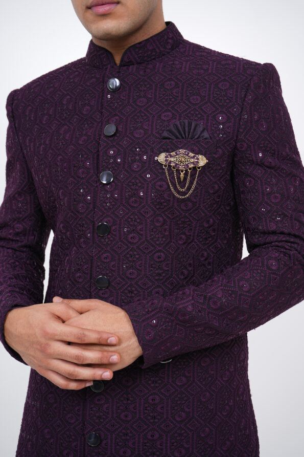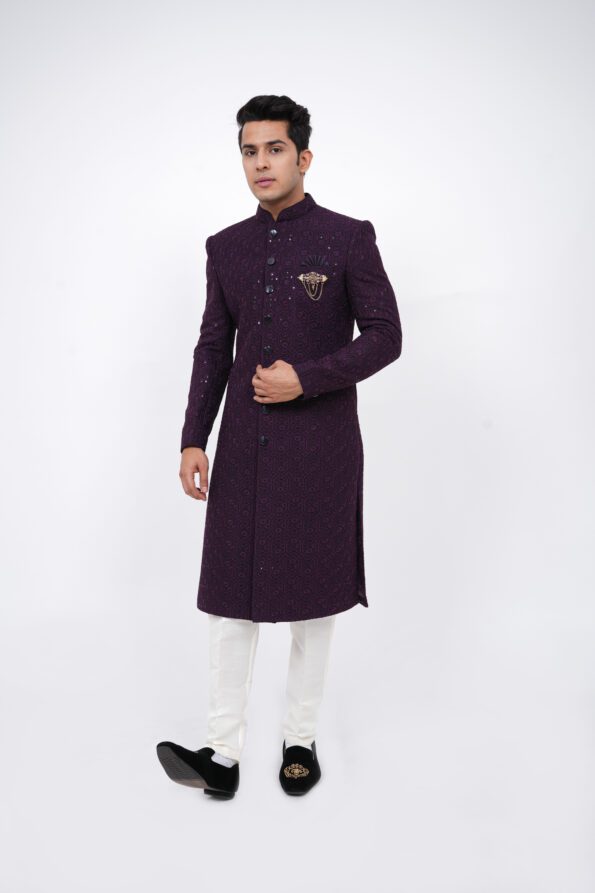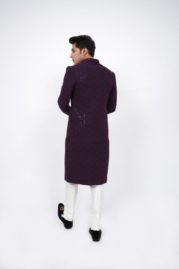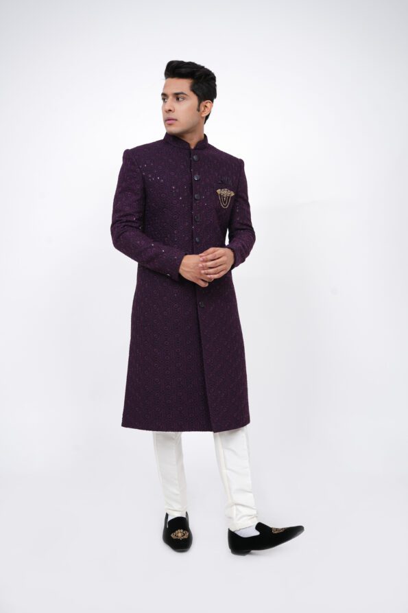 New age design on a traditional indo-western outfit brings out the perfect fusion you will need this shaadi season! Purple georgette fabric adorned with lakhnavi work and black sequencing to form a shining impression on the crowd. Standing out has never been easier!