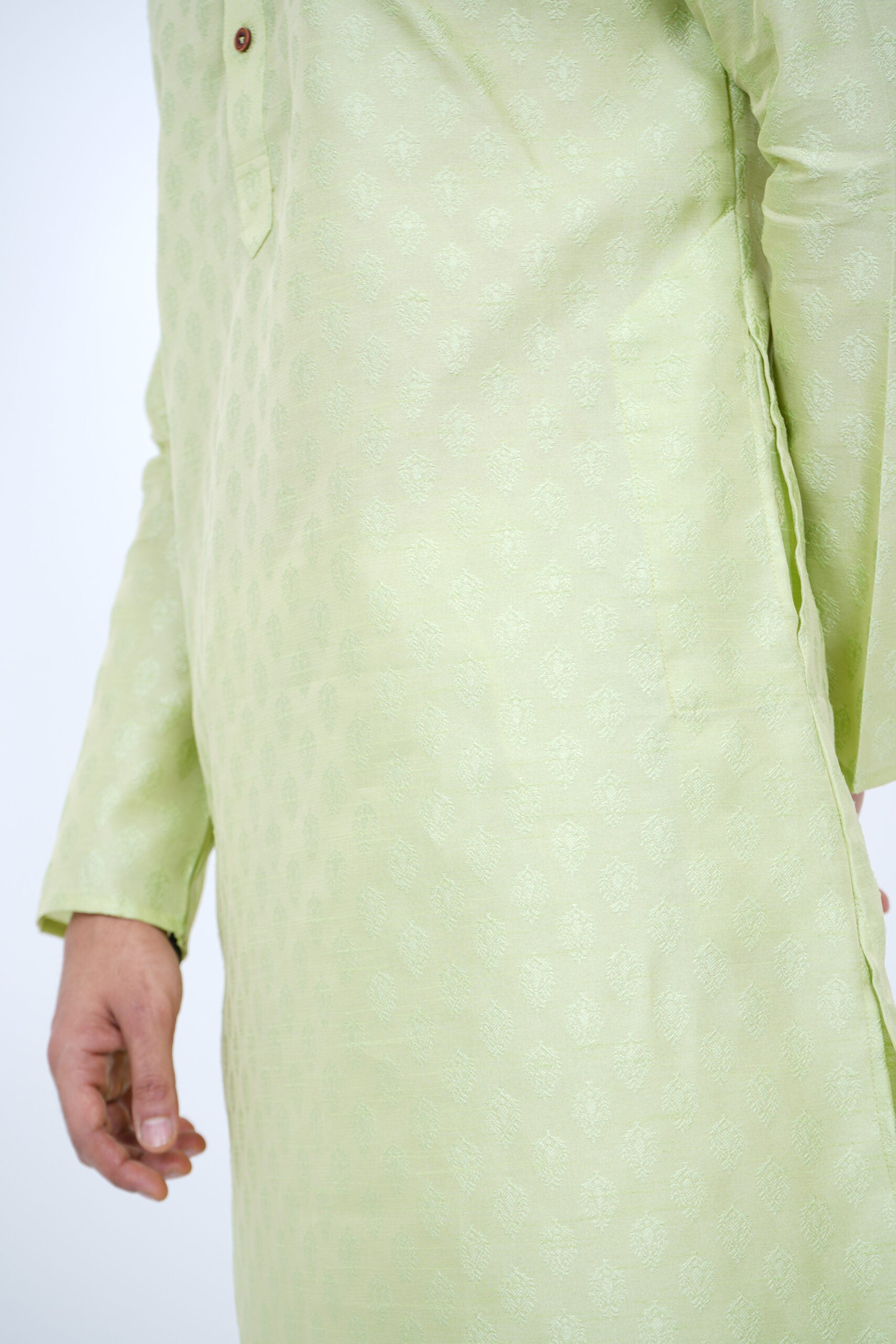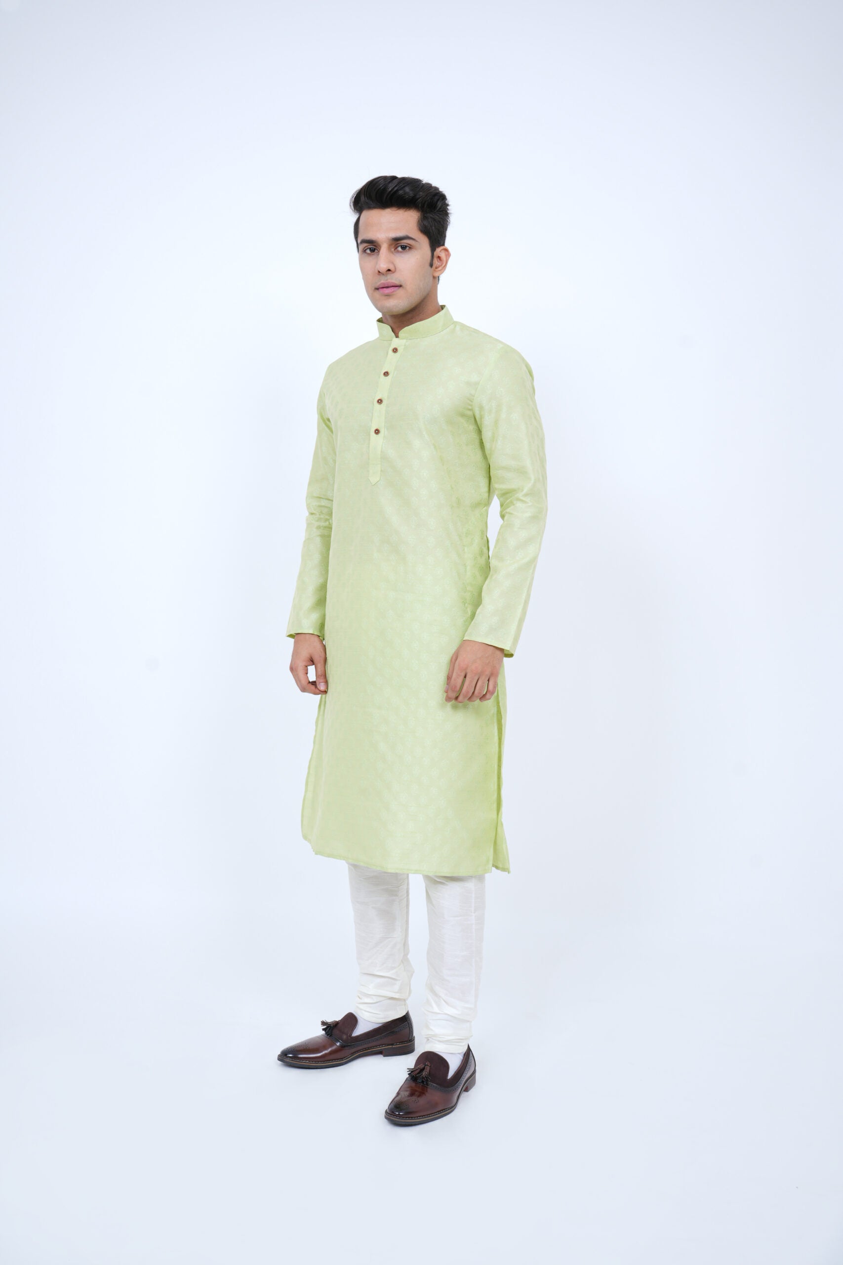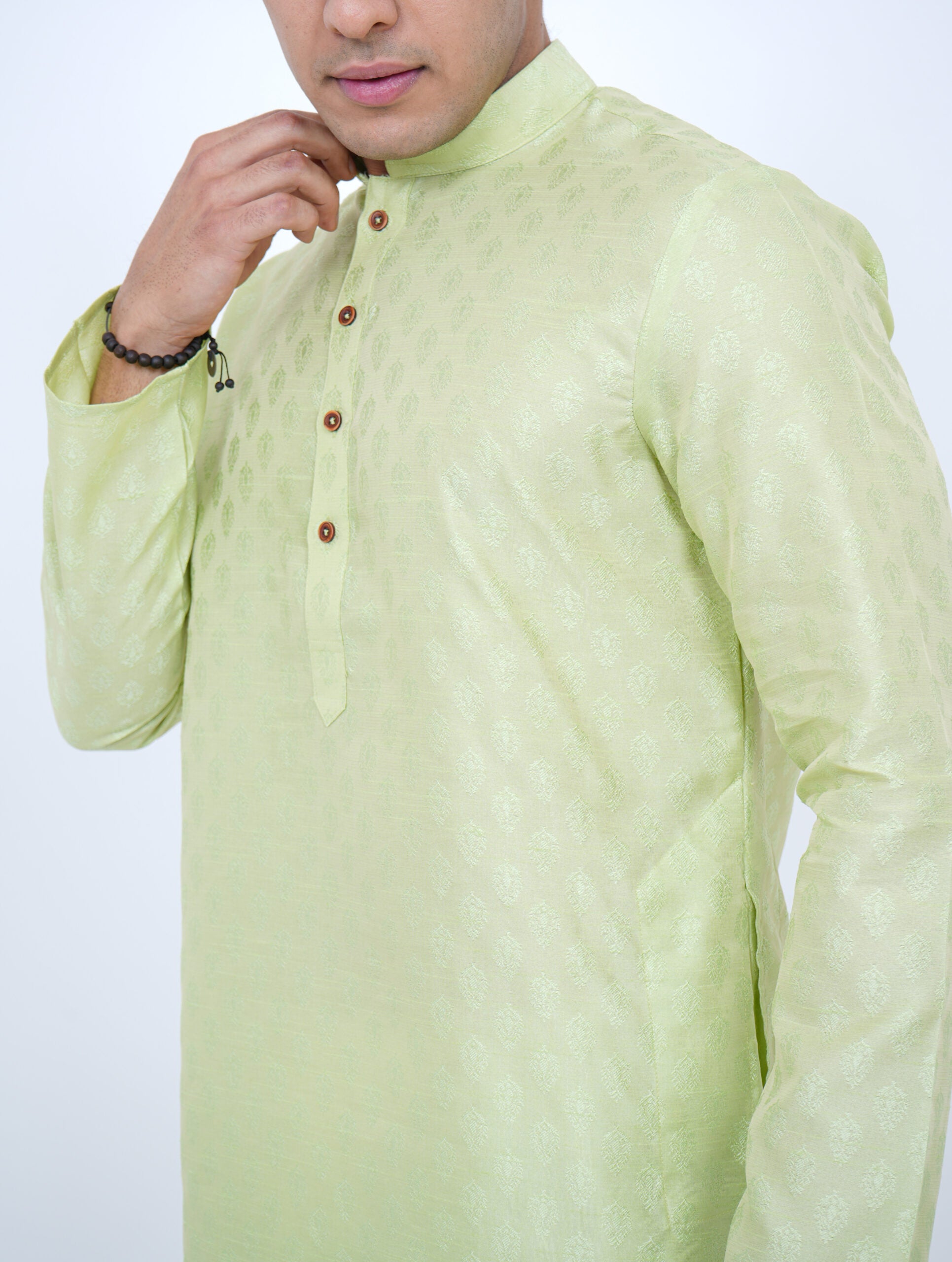 This season be ready to be cooled by this easy-on-the-eyes lime green-colored kurta with threadwork motifs and neckwork, paired with a white pant-style pajama. This distinct shade of green is best worn in summer and is adorned with contrasting wooden buttons. Looking sharp has never been cooler!