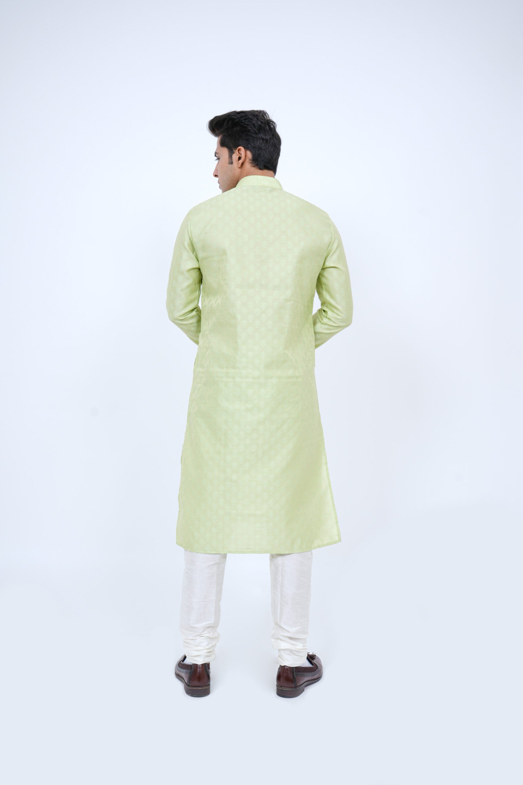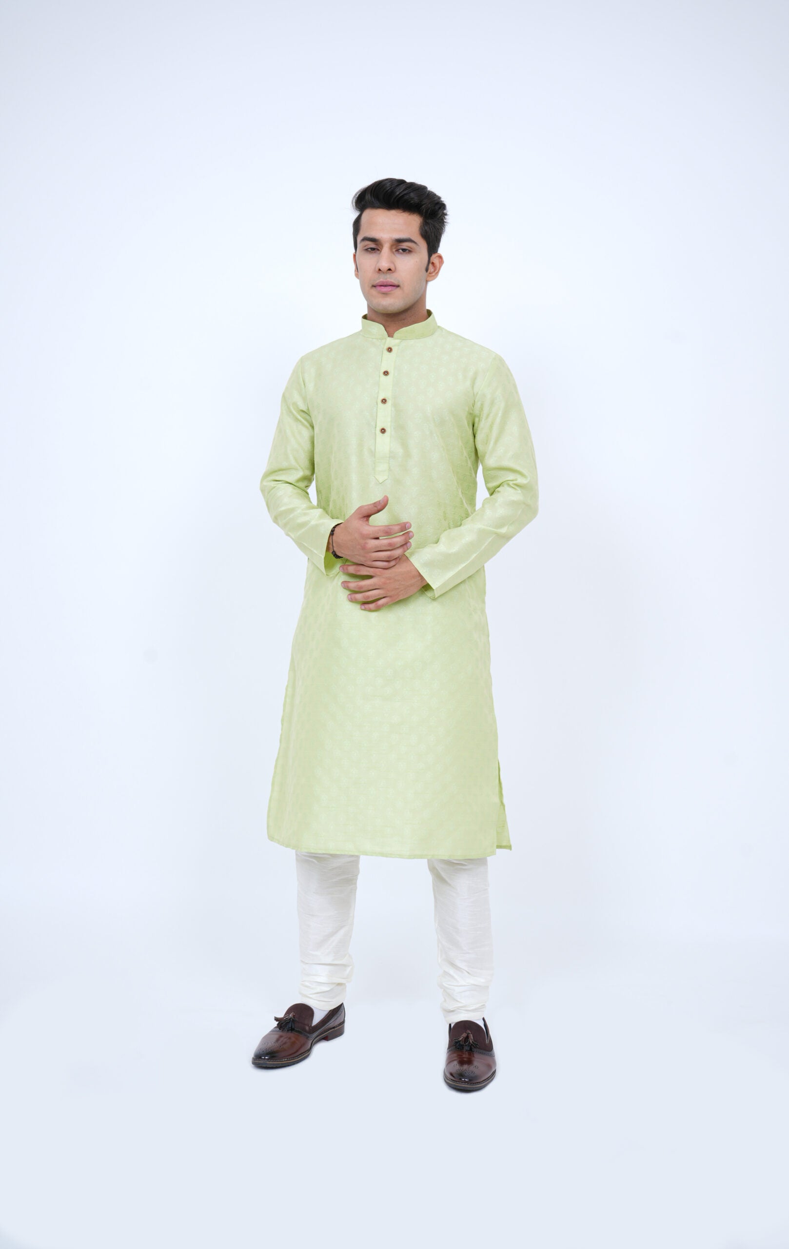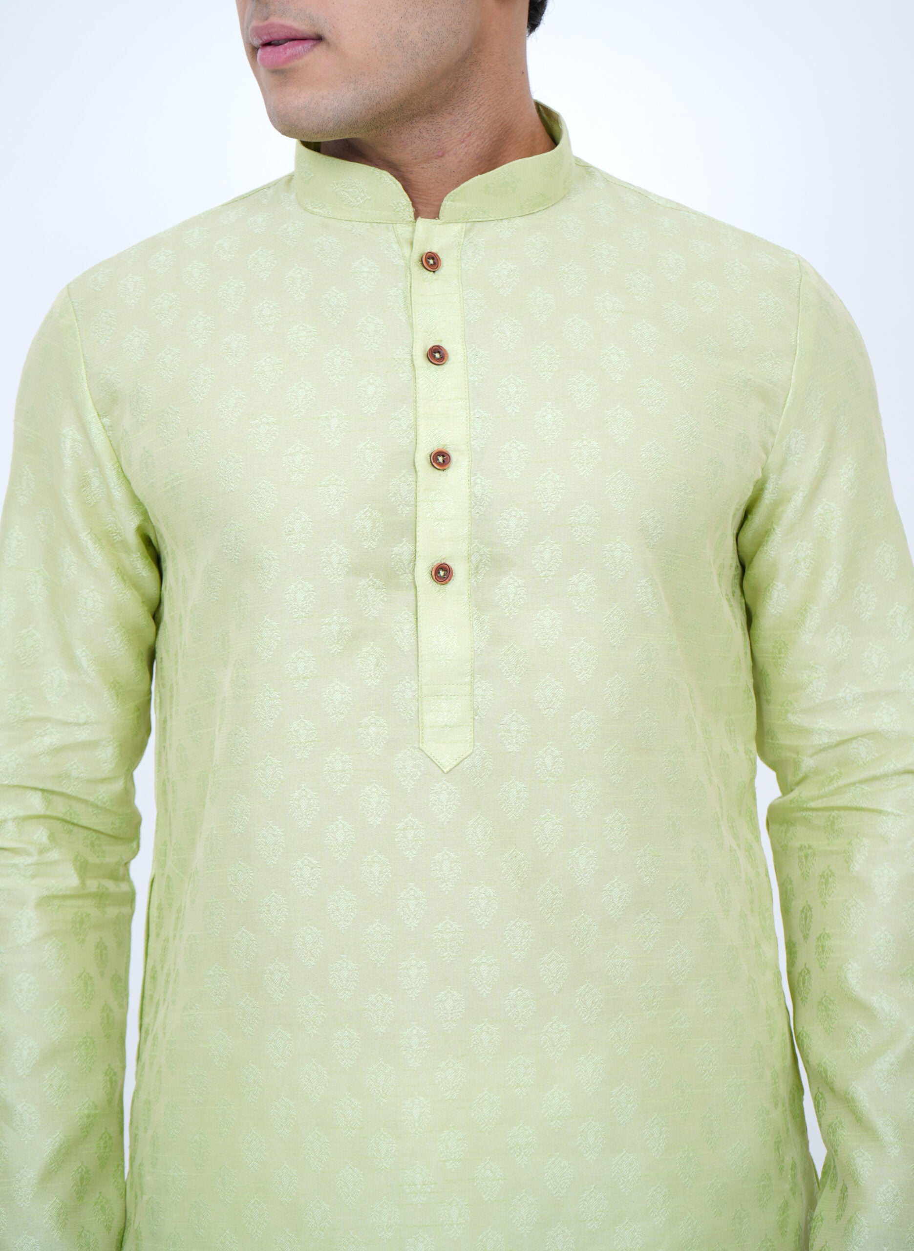 This season be ready to be cooled by this easy-on-the-eyes lime green-colored kurta with threadwork motifs and neckwork, paired with a white pant-style pajama. This distinct shade of green is best worn in summer and is adorned with contrasting wooden buttons. Looking sharp has never been cooler!