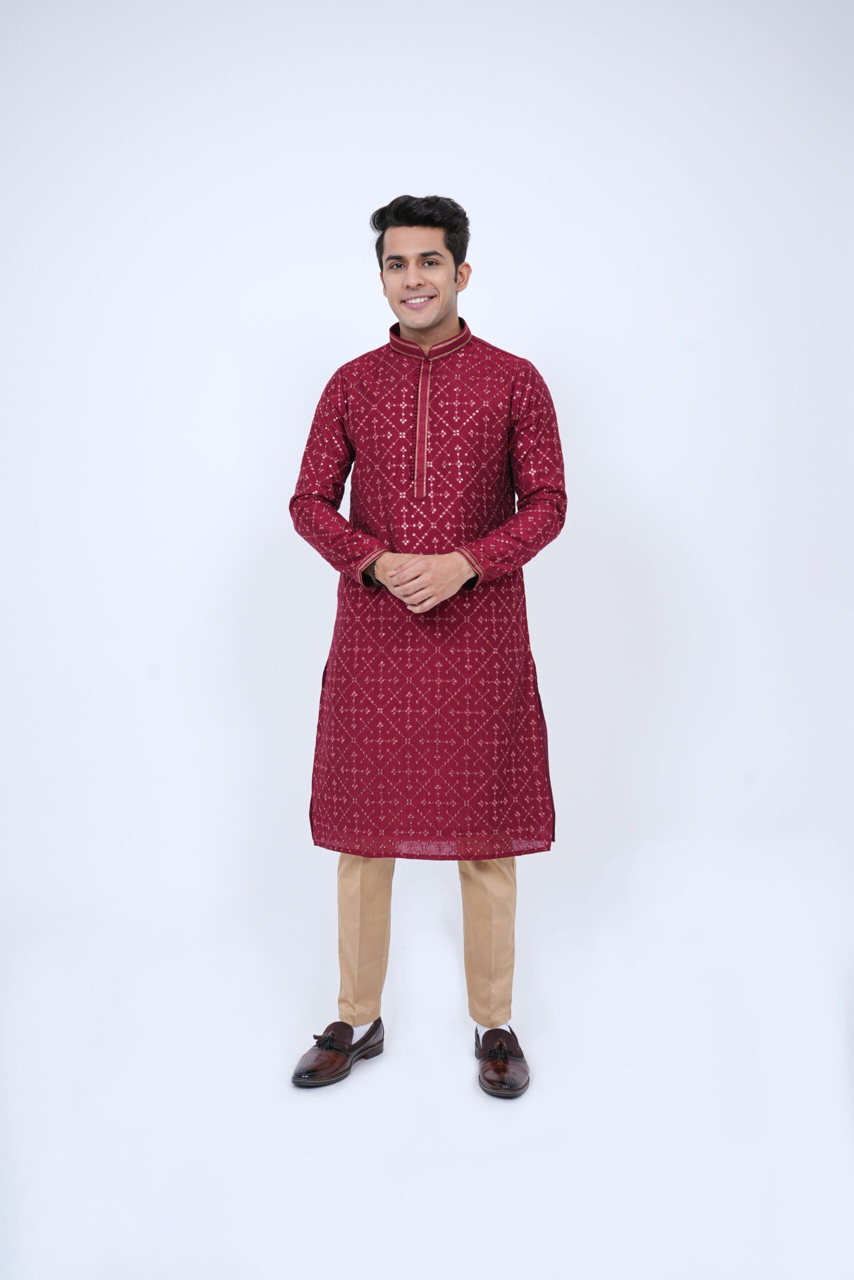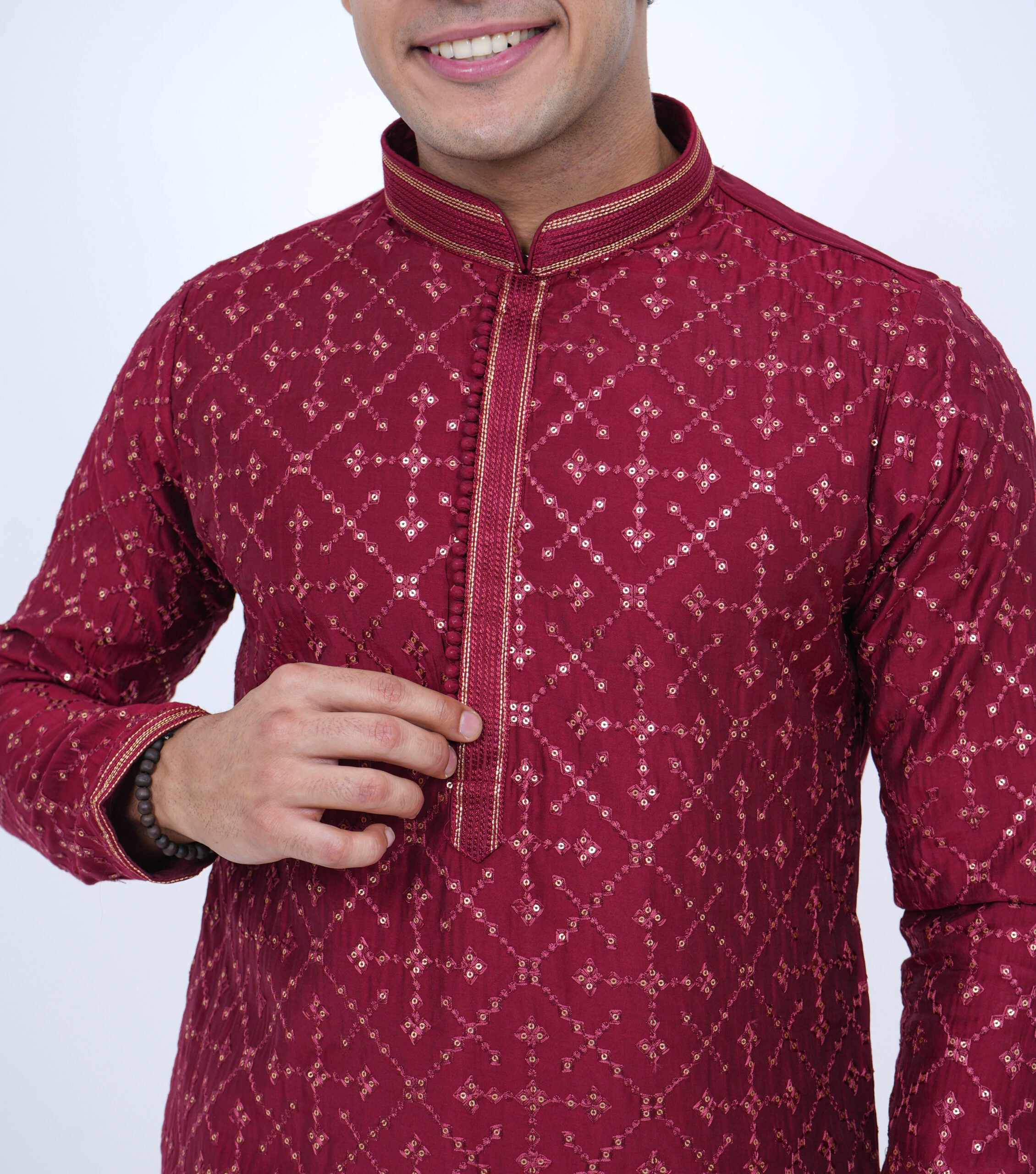 Red is never out of fashion and neither should you! We bring you this statement Kurta with golden pant-style pajama that provide you with a royal look. The kurta is studded with sequencing and thread work designed by master designers and they are the main attraction of this dress and give it the uniqueness you demand. This festival season be ready to be dashing in red!