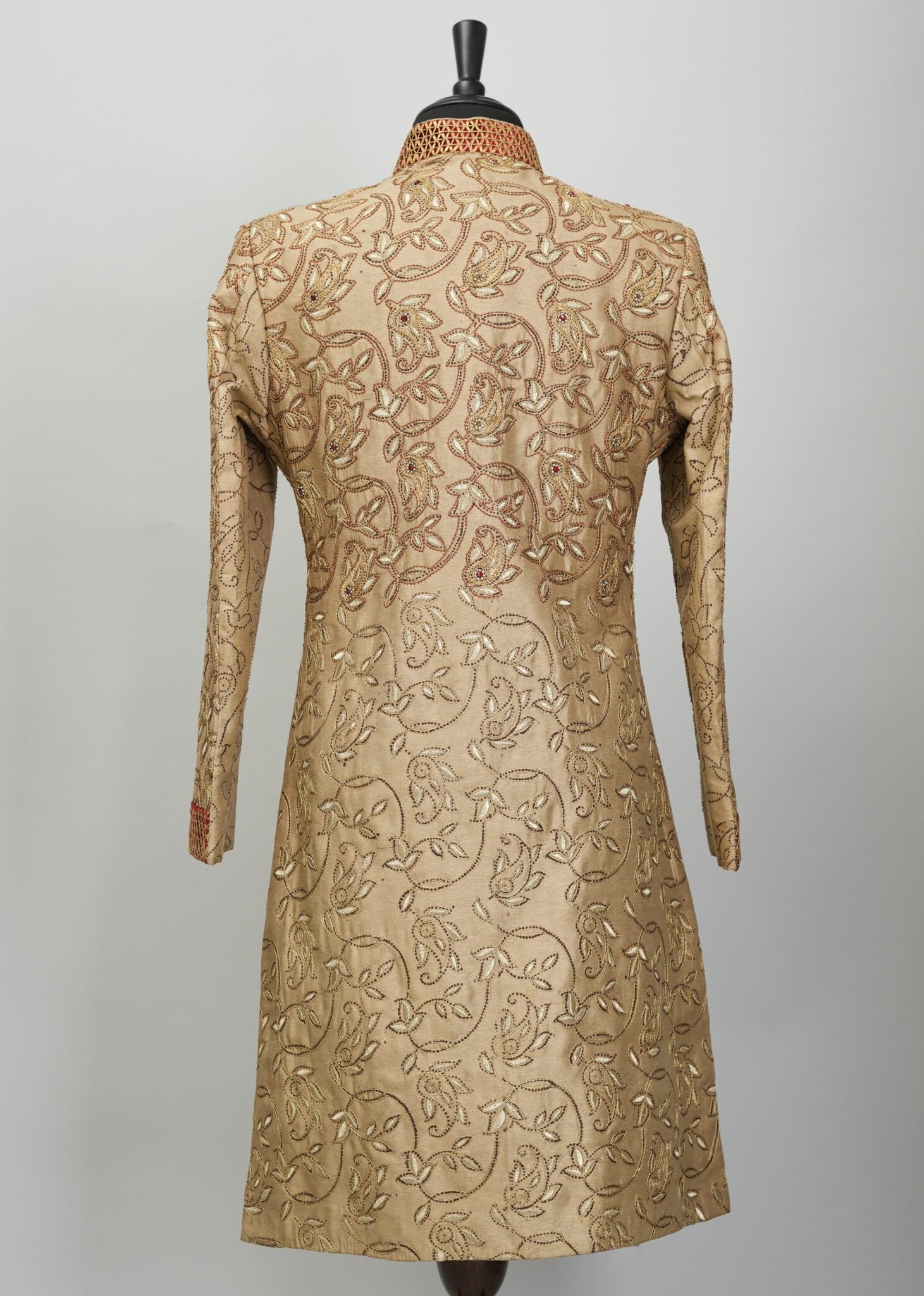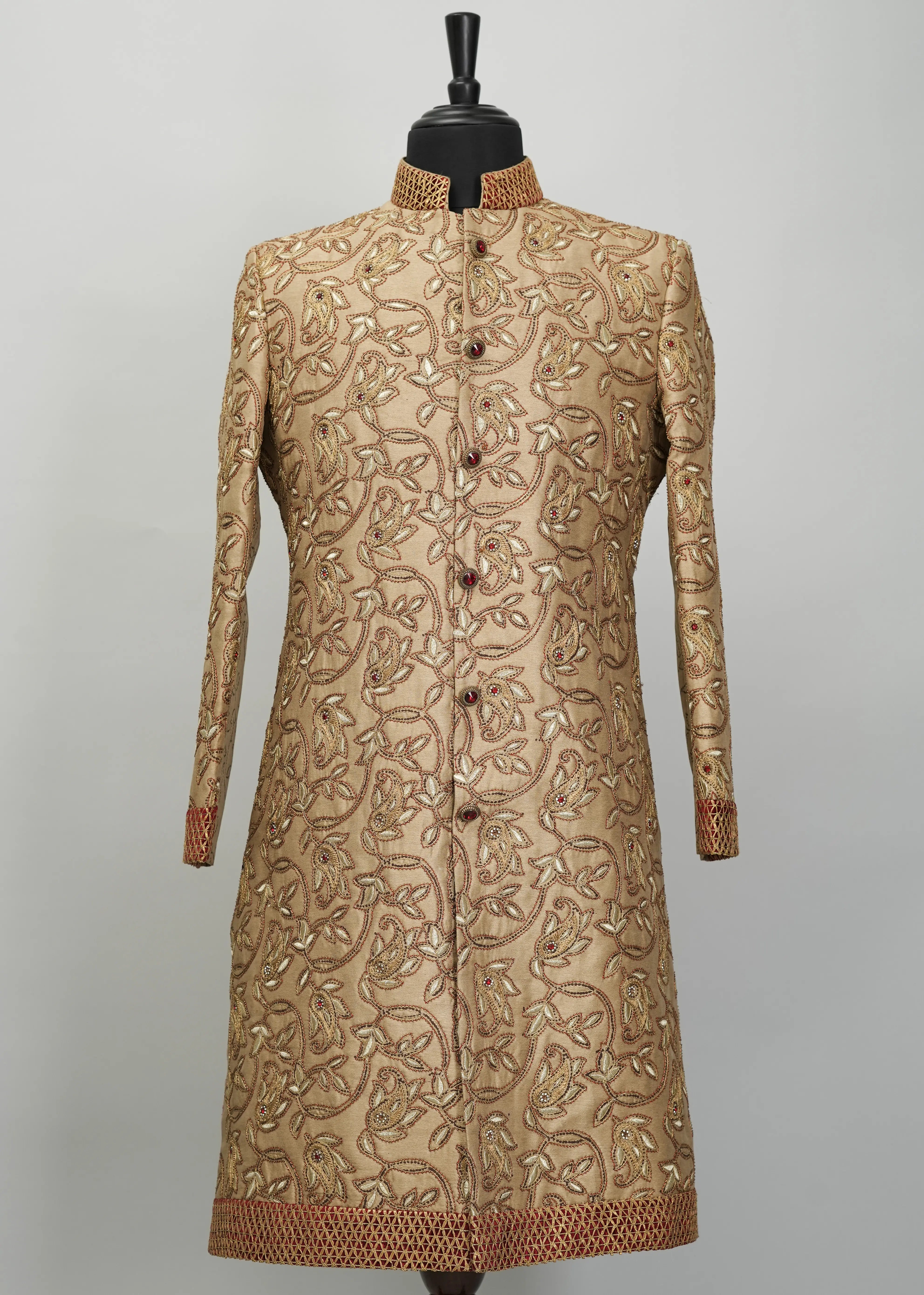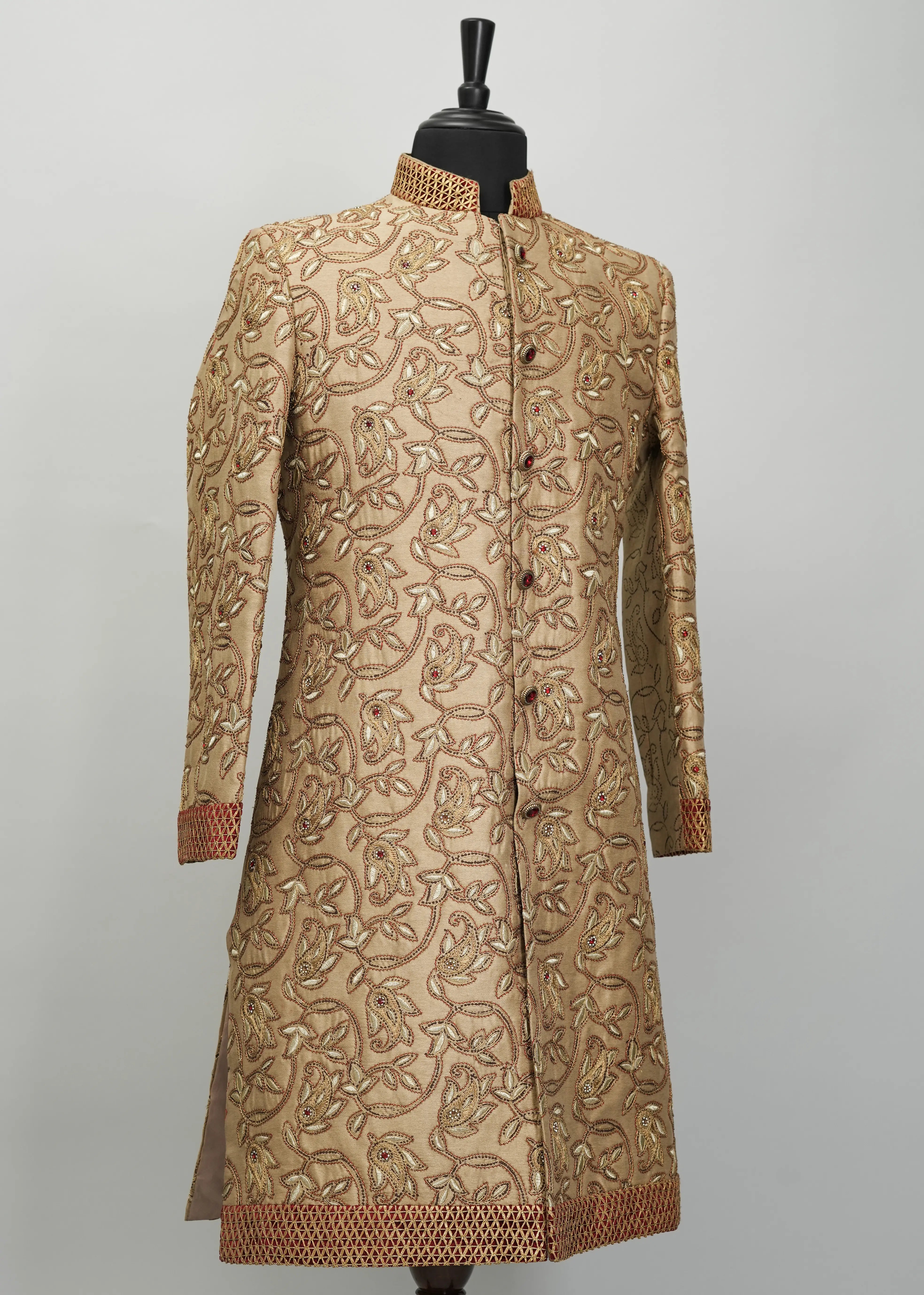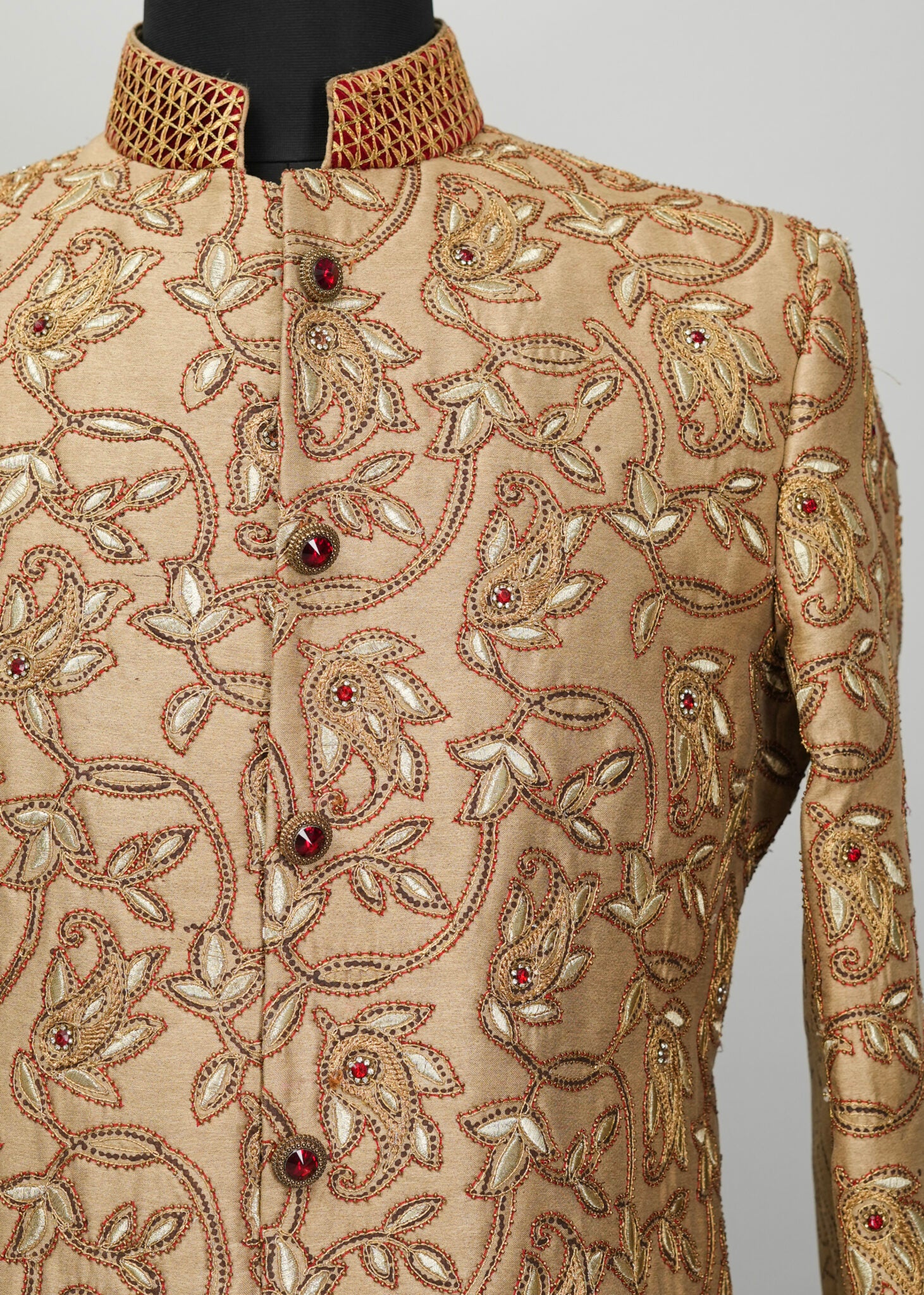 Handmade customized designer men's indowestern sherwani. Made from Silk blend fabric with satin finish that makes it comfortable eastern men's outfit to wear at wedding and other traditional occasions.