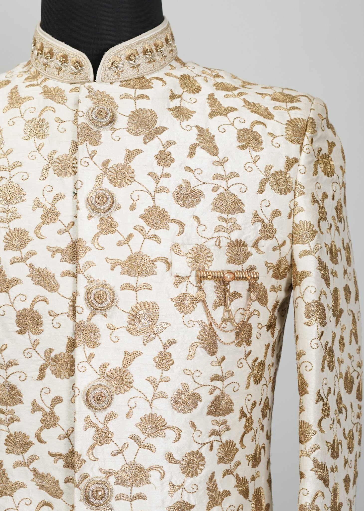 The internal composition of fully fused fabric gives this a composed look and stays in form even after long hours of wearing.(Embroidery Work, Broach, PAjama , pocket Square , silk Material and Cream Colour.)