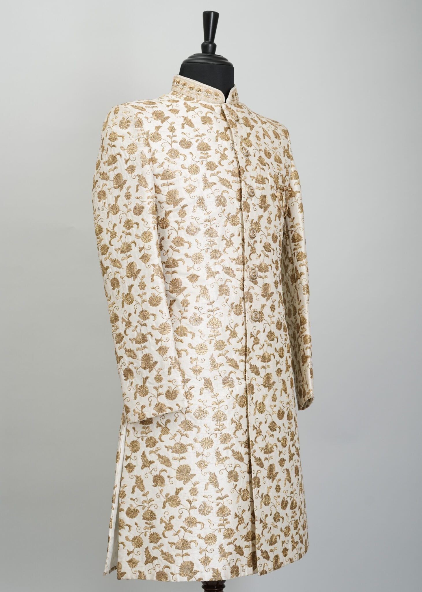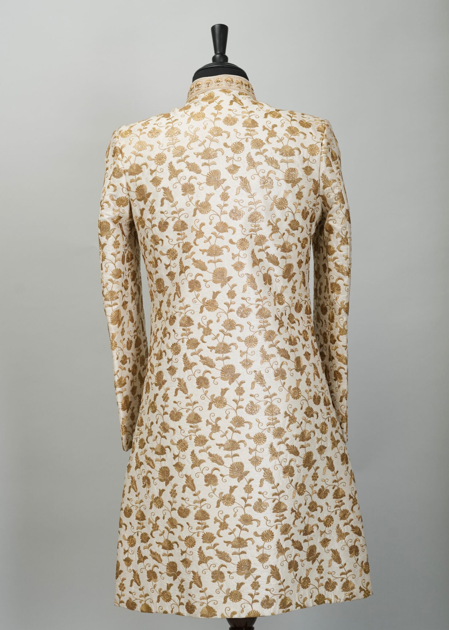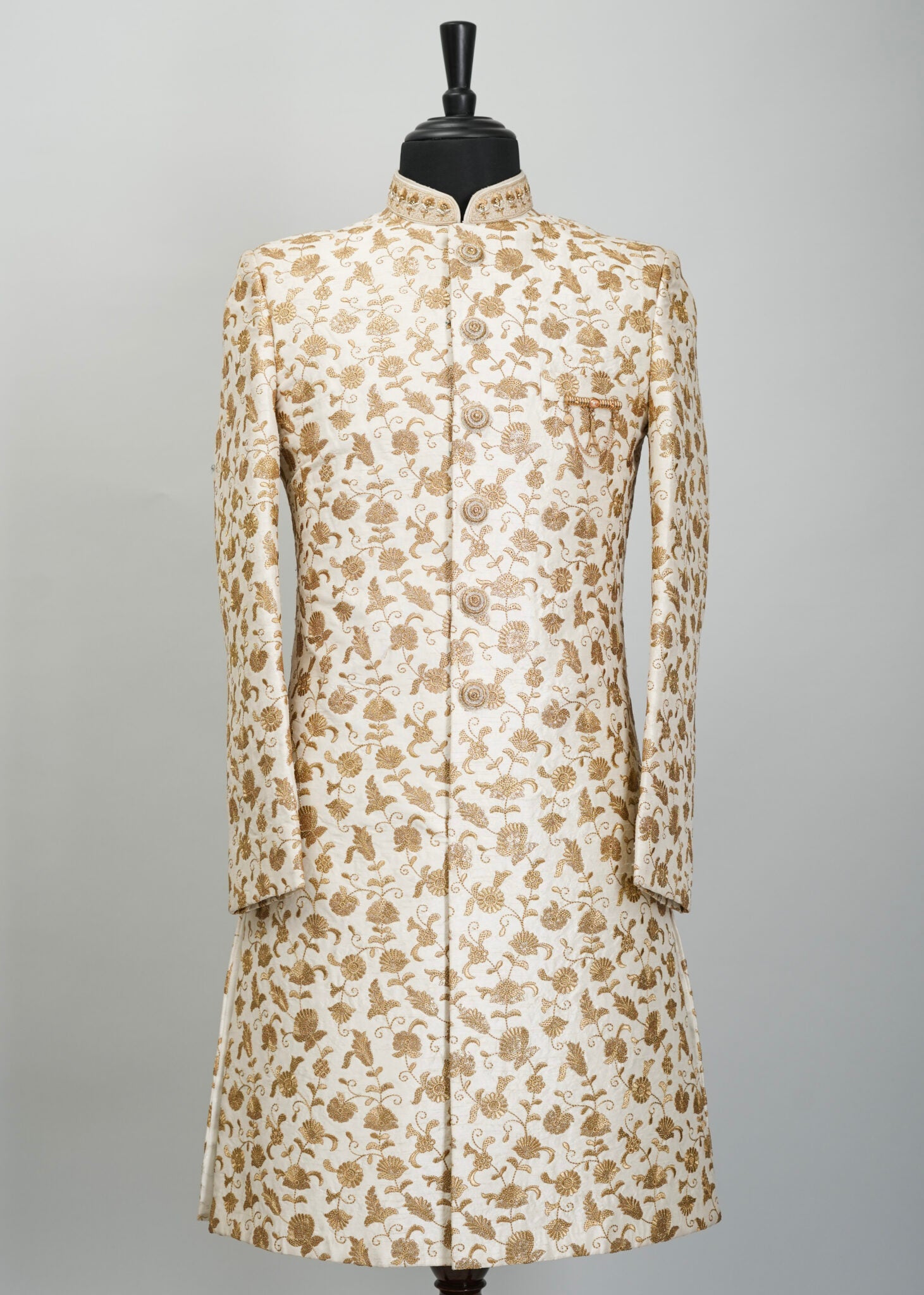 Handmade customized designer men's indowestern sherwani. Made from Silk blend fabric with satin finish that makes it comfortable eastern men's outfit to wear at wedding and other traditional occasions.