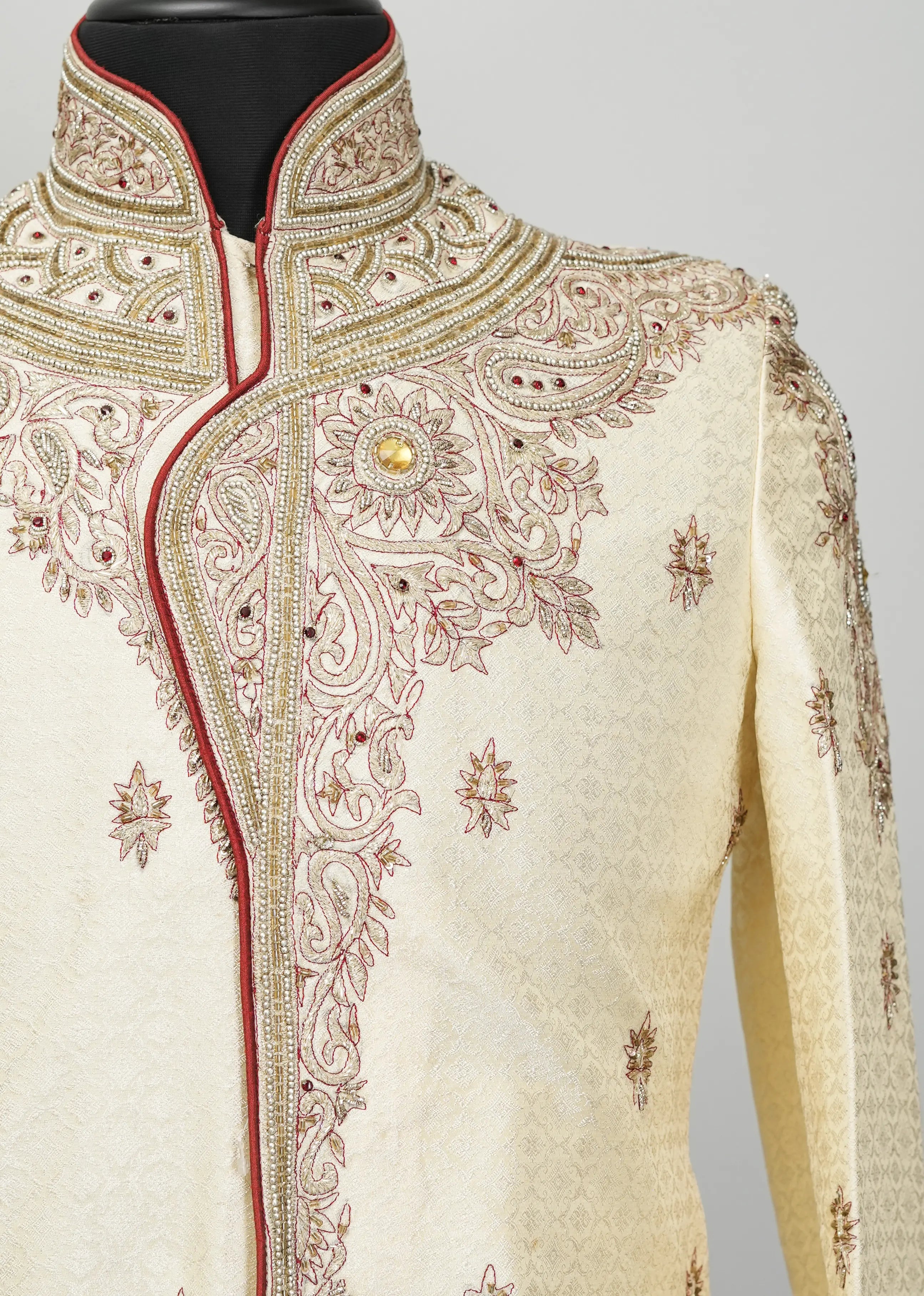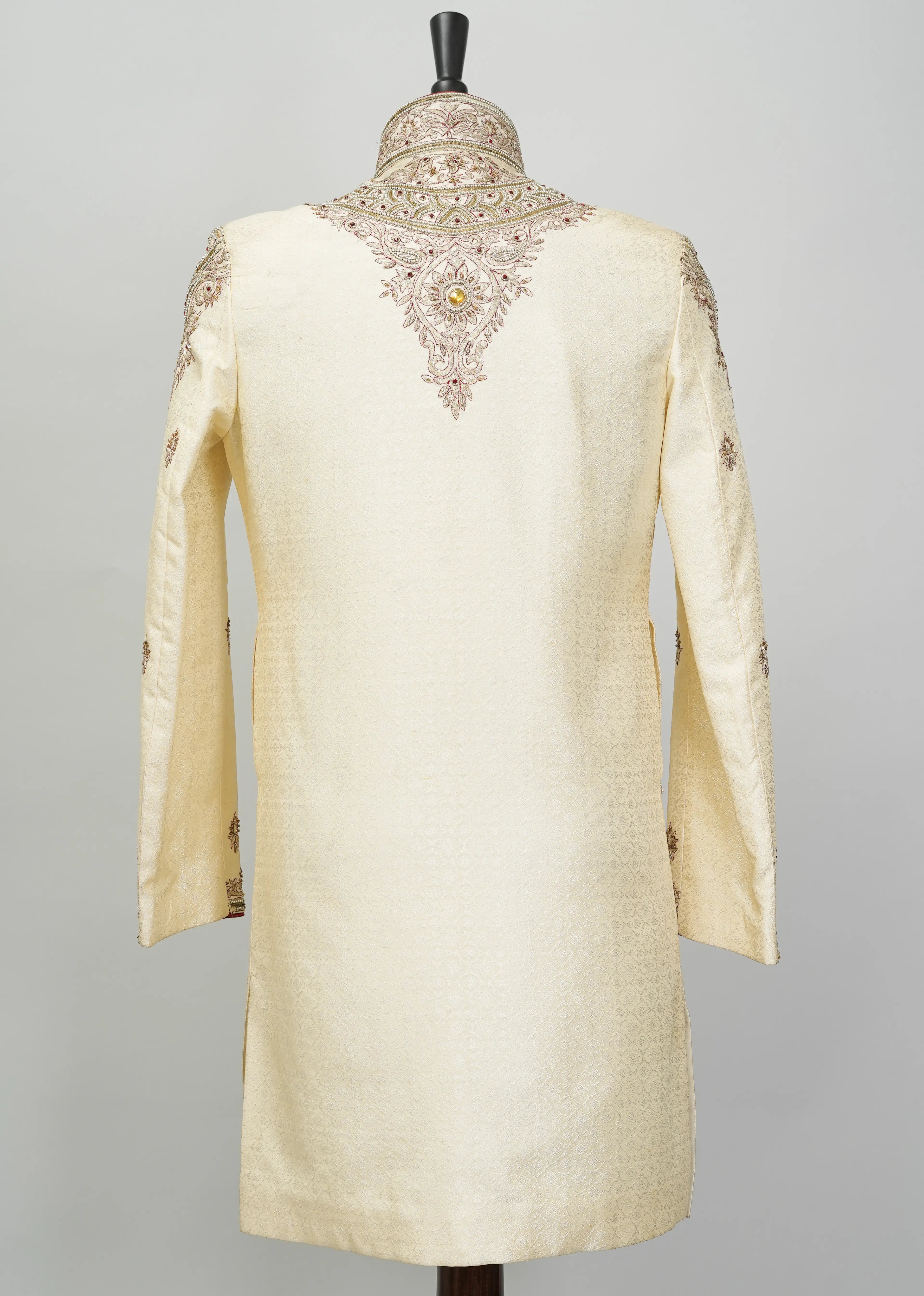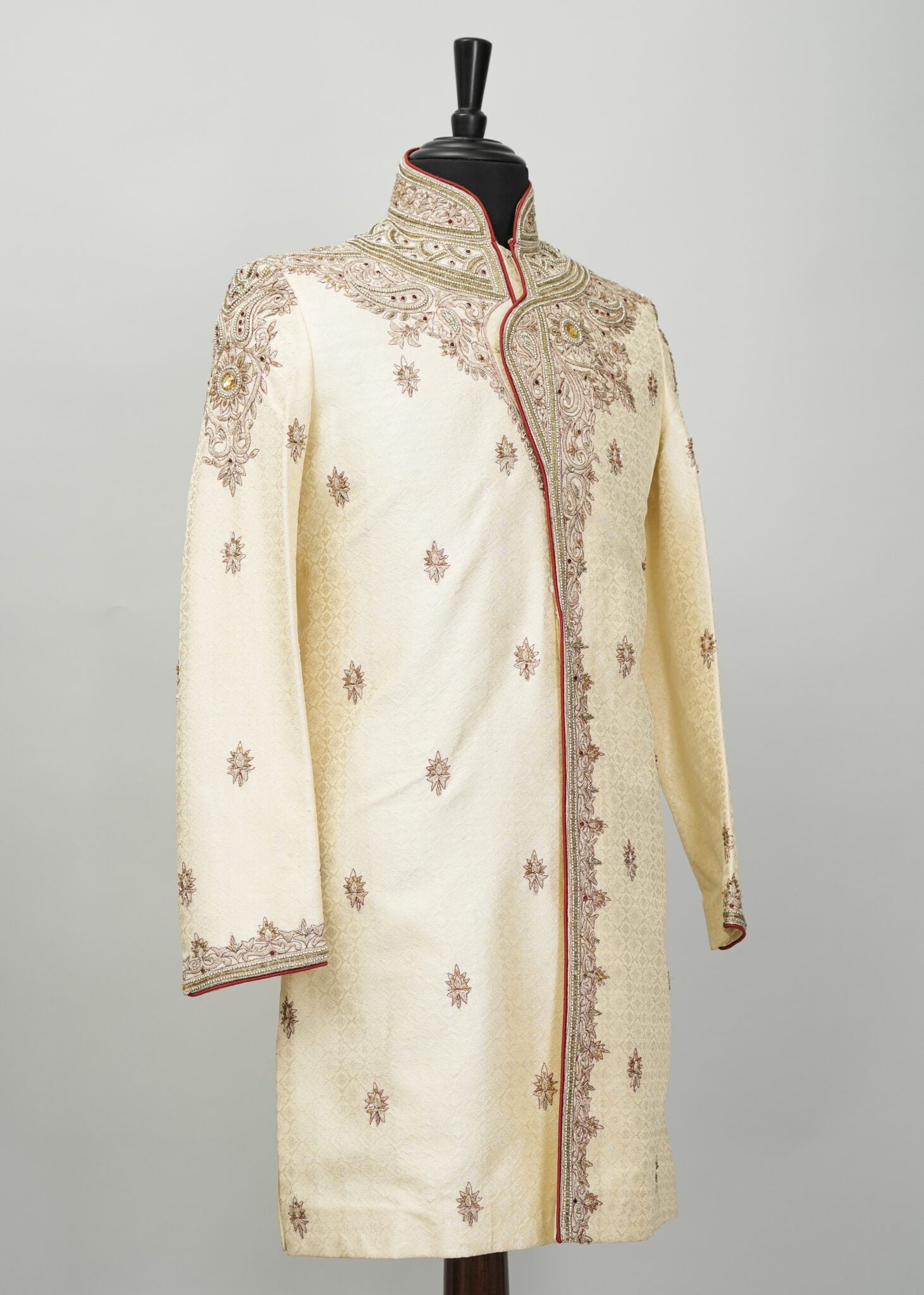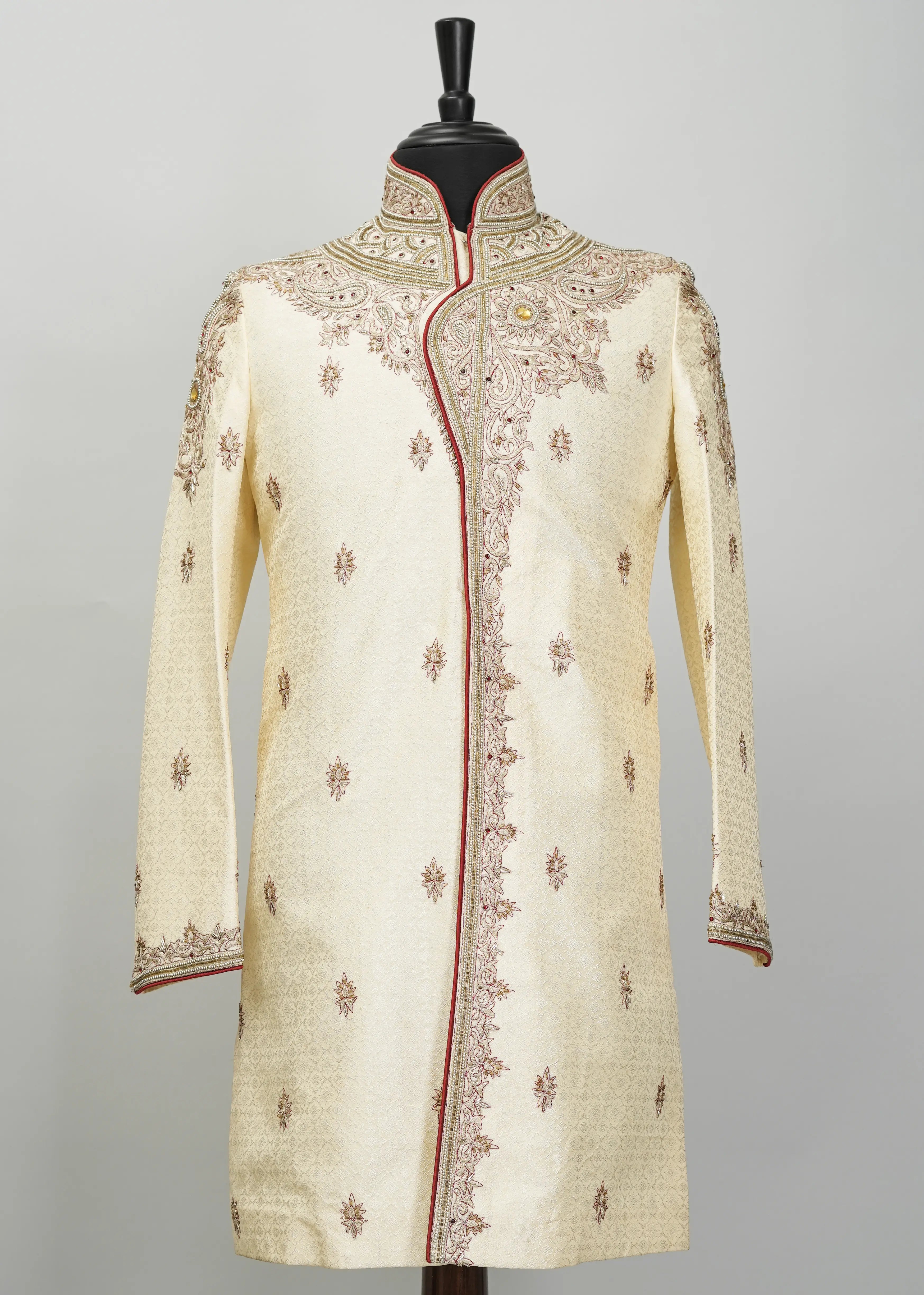 Handmade customized designer men's indowestern sherwani. Made from Silk blend fabric with satin finish that makes it comfortable eastern men's outfit to wear at wedding and other traditional occasions.