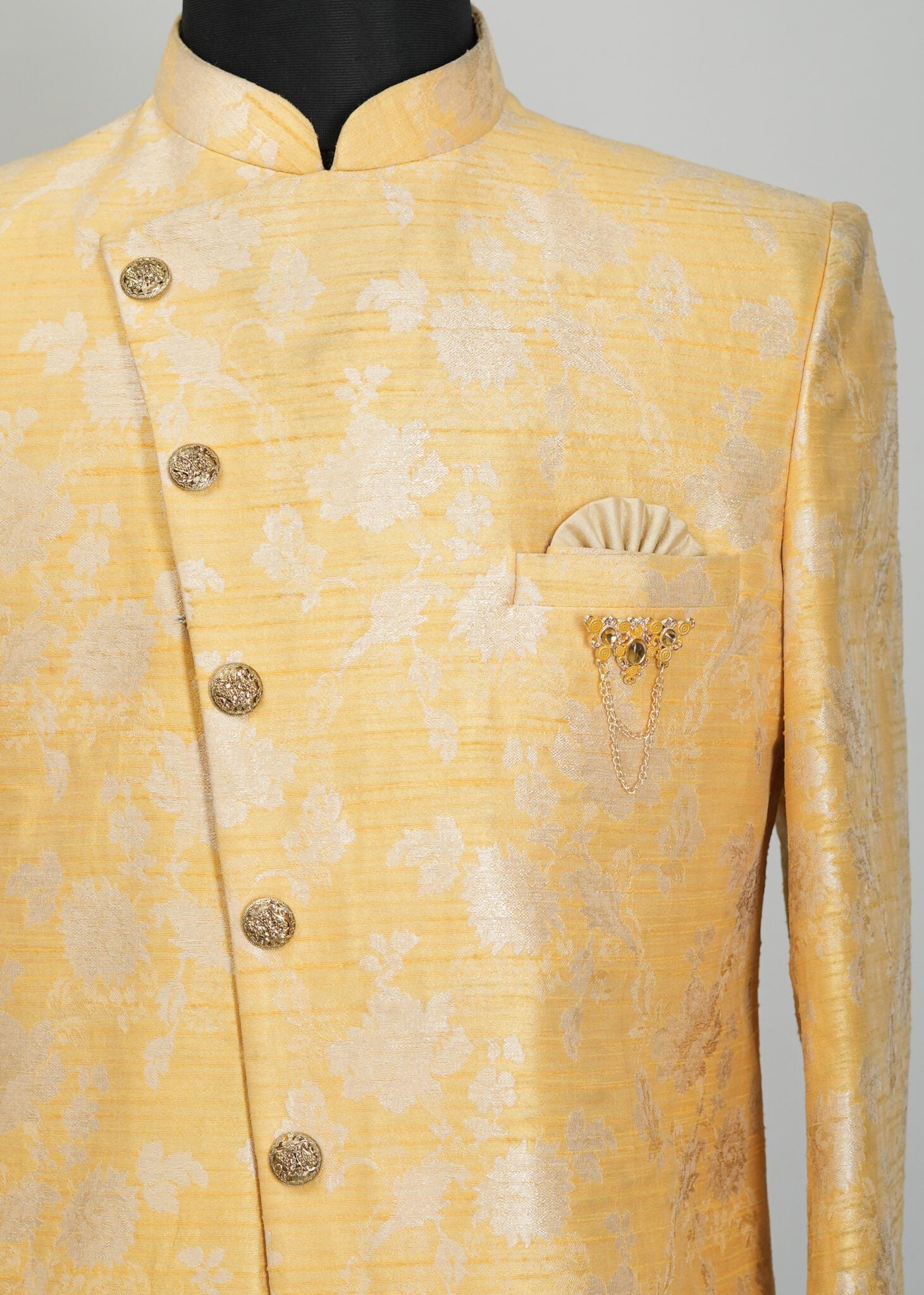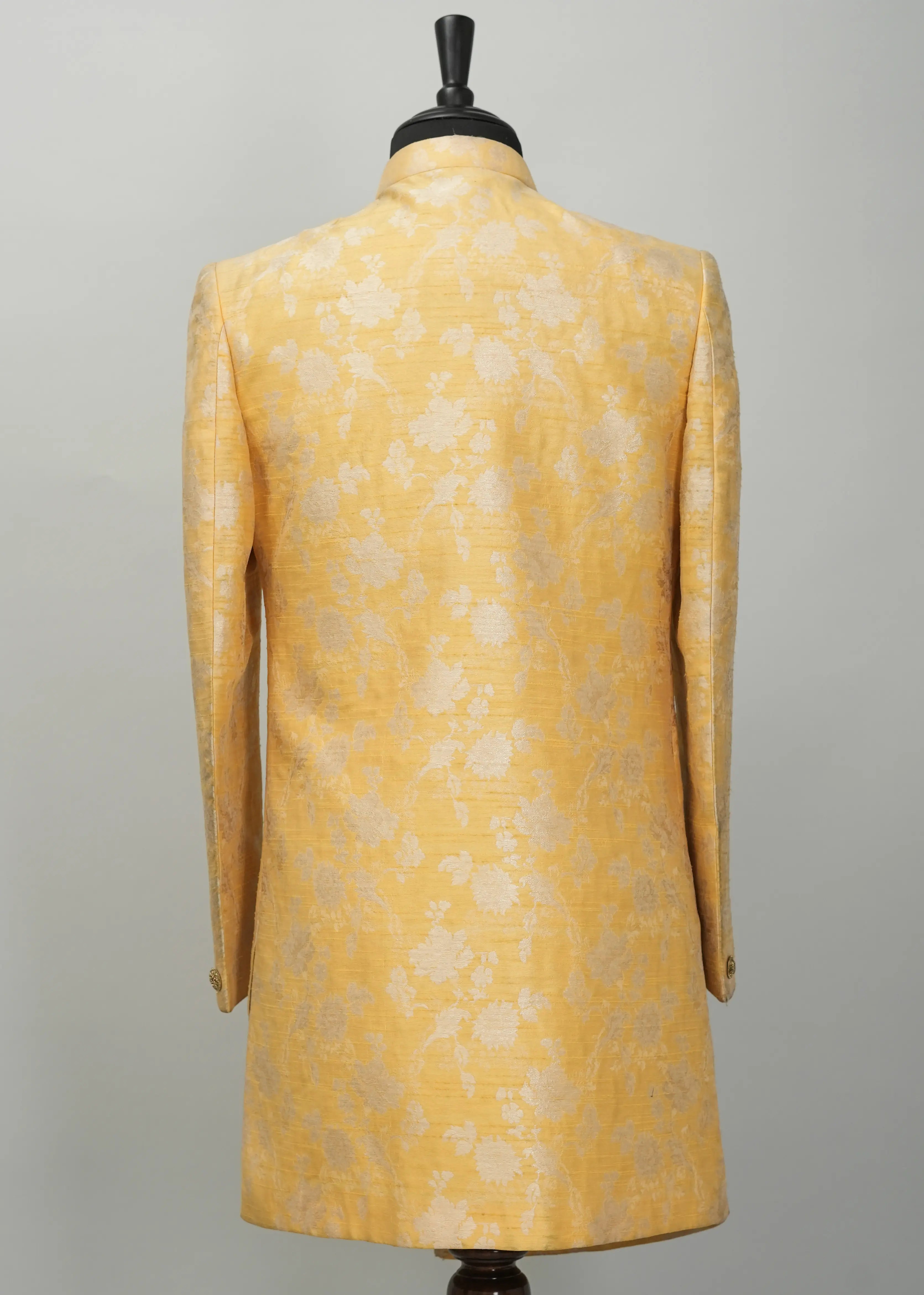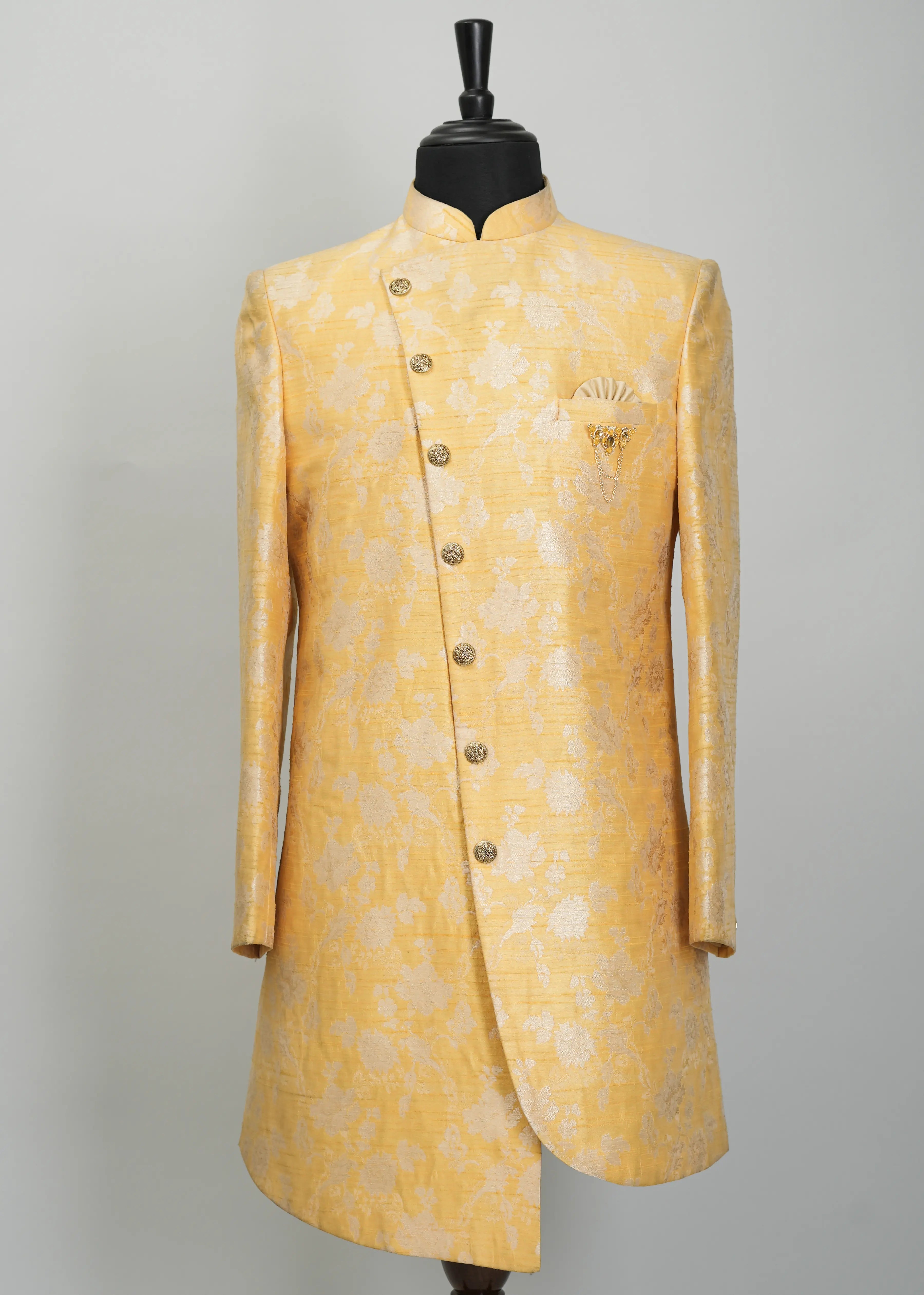 Handmade customized designer men's indowestern sherwani. Made from Silk blend fabric with satin finish that makes it comfortable eastern men's outfit to wear at wedding and other traditional occasions.